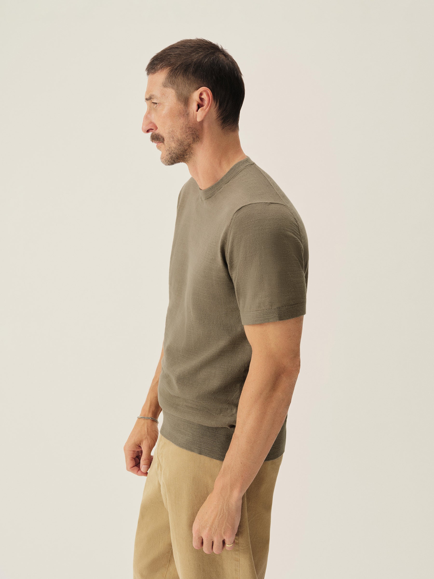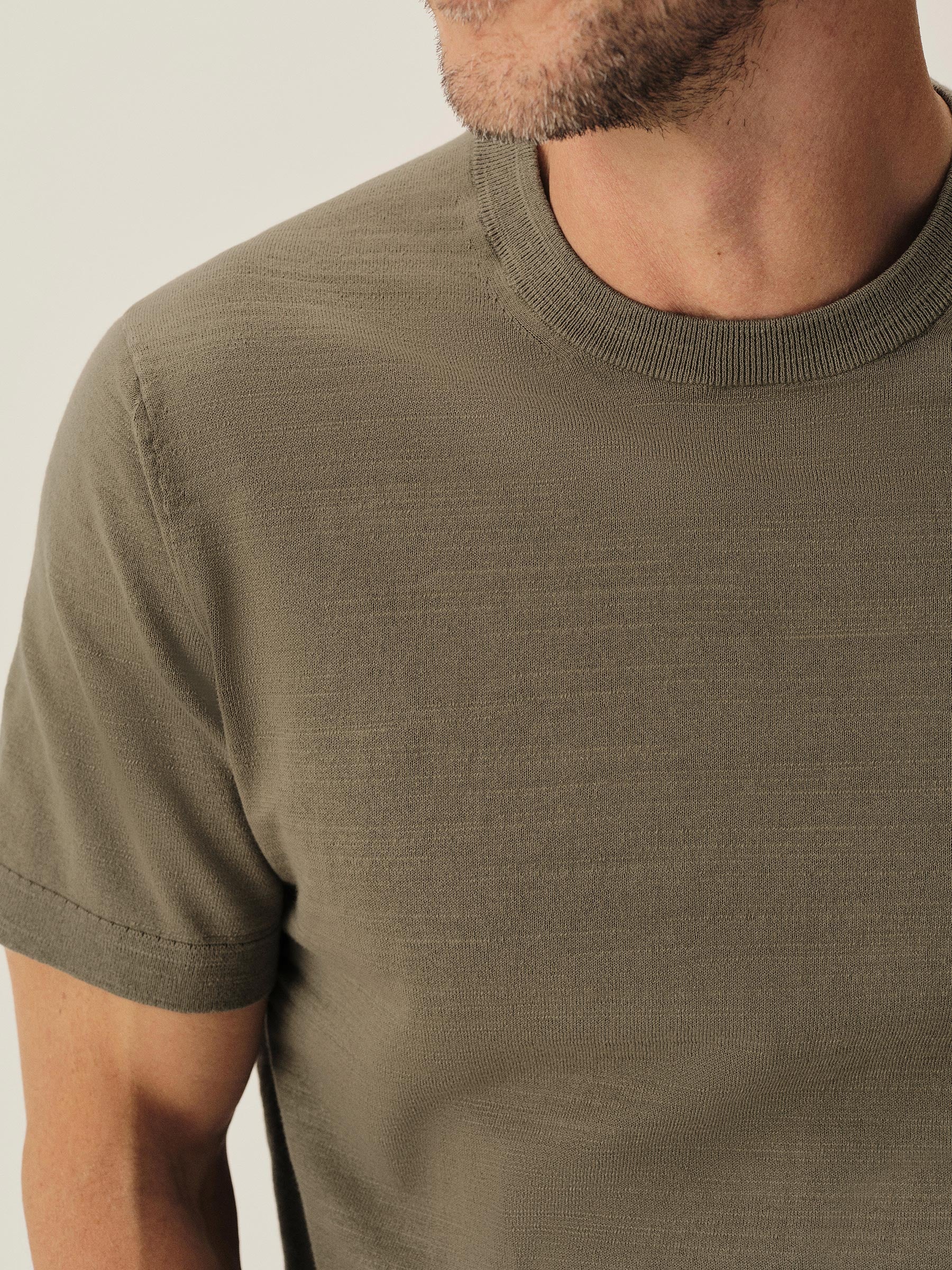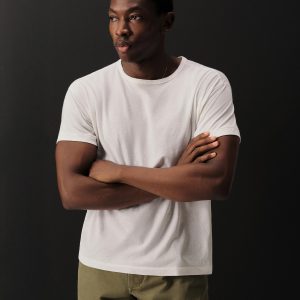 Classic fit short sleeve sweater tee with a straight hem. Yarn-dyed 16 gauge cotton jersey features light slub texture. Features double layer 1×1 ribbing at the collar and rib finishing at the cuffs and hem. Constructed with hand-linked seams for improved durability.