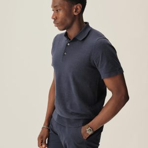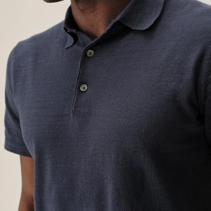 Classic fit sweater polo in yarn-dyed 16 gauge cotton jersey with light slub texture. Features a three-button closure and rib finishing at the cuffs and hem. Constructed with hand-linked seams for improved durability.