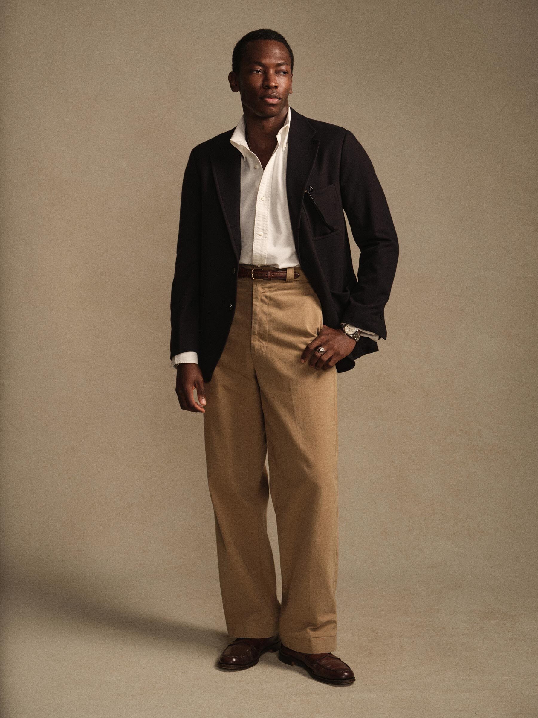 Inspired by 1960s military-issued chinos, an authentic period silhouette with a high rise, full top block, and a full leg. Cut from sulfur-dyed Japanese twill and constructed with busted seaming at the back rise, inseams, and outseams, along with tunnel belt loops and single-welt back pockets. Finished with corozo buttons, a Talon 42 zip, and a zip fly Stonewashed for a lived-in look and feel.
