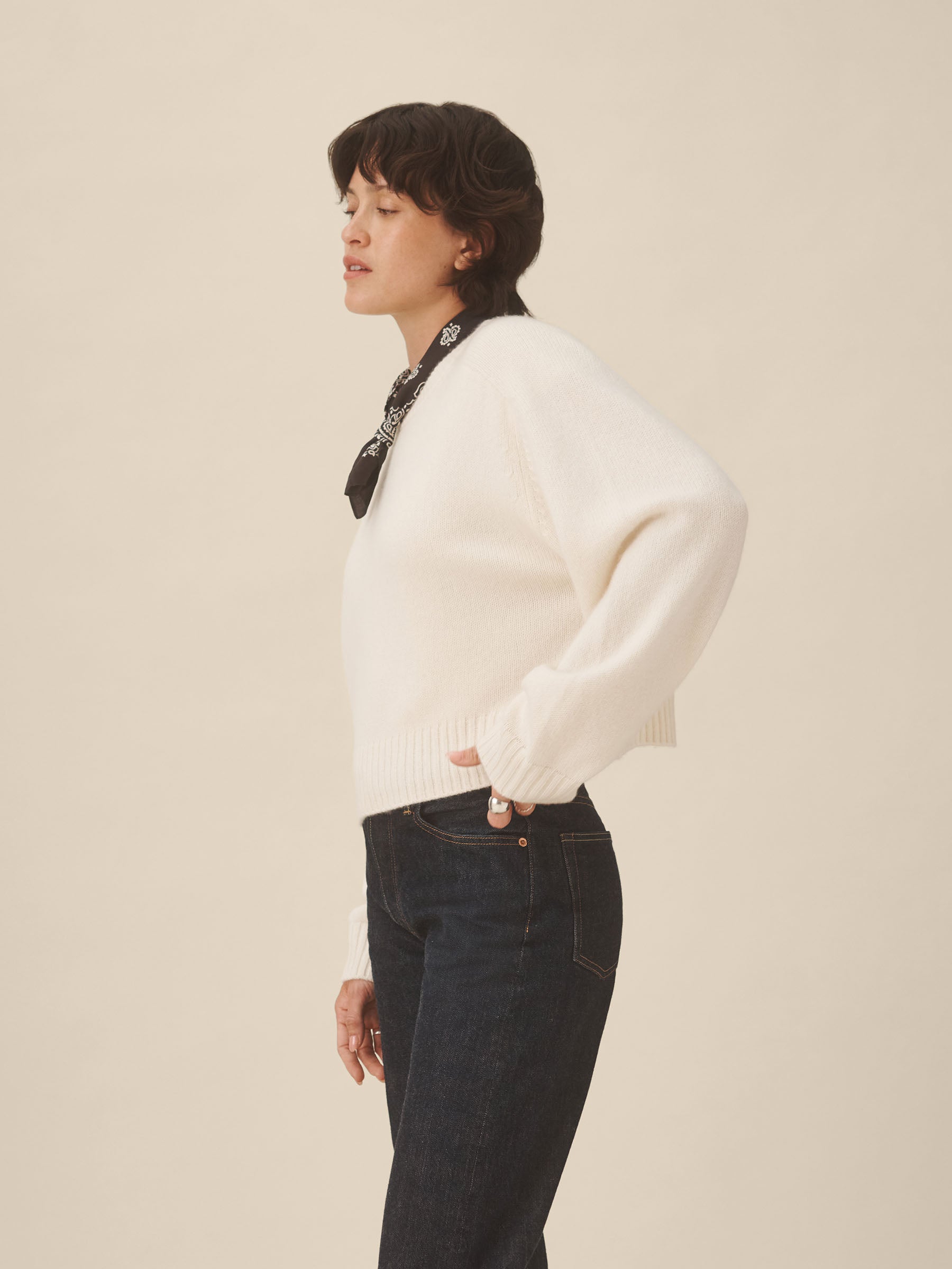 A cozy crewneck crafted from 100% cashmere in a soft jersey stitch. Designed with a boxy, oversized silhouette and saddle-shaped armholes, and finished with ribbed trims at the neckline, cuffs, and hem.
