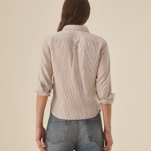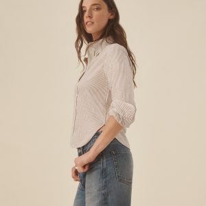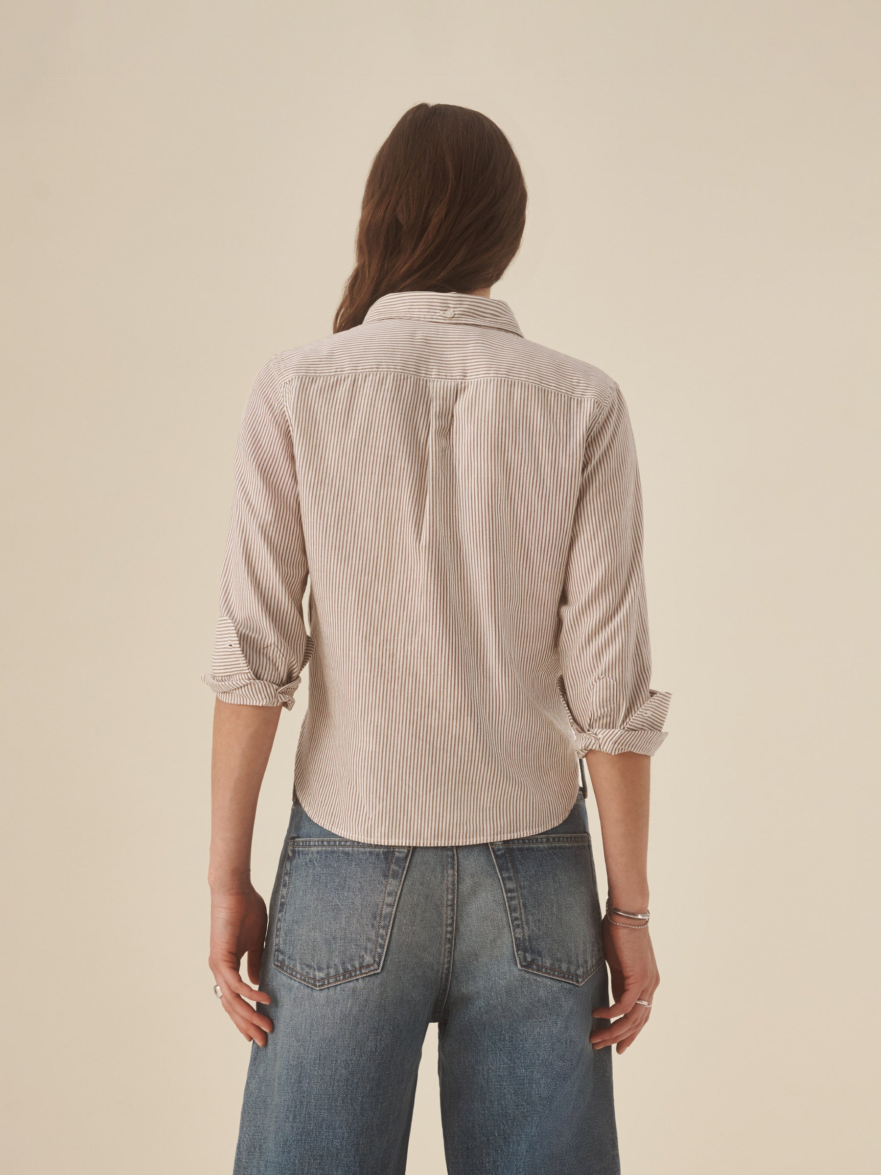 Inspired by 1950s men’s dress shirts, an Oxford cut from a natural, yarn-dyed fiber blend with a soft hand and crisp structure. Our slimmest shirt yet, it’s designed with a button-down collar that holds the perfect roll, stacked mother-of-pearl buttons, and felled seams for durability. Details include knife pleats at the cuff, a box pleat at the back yoke, and a shrunken silhouette made to layer under a blazer or wear solo.