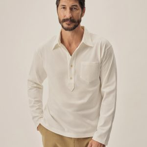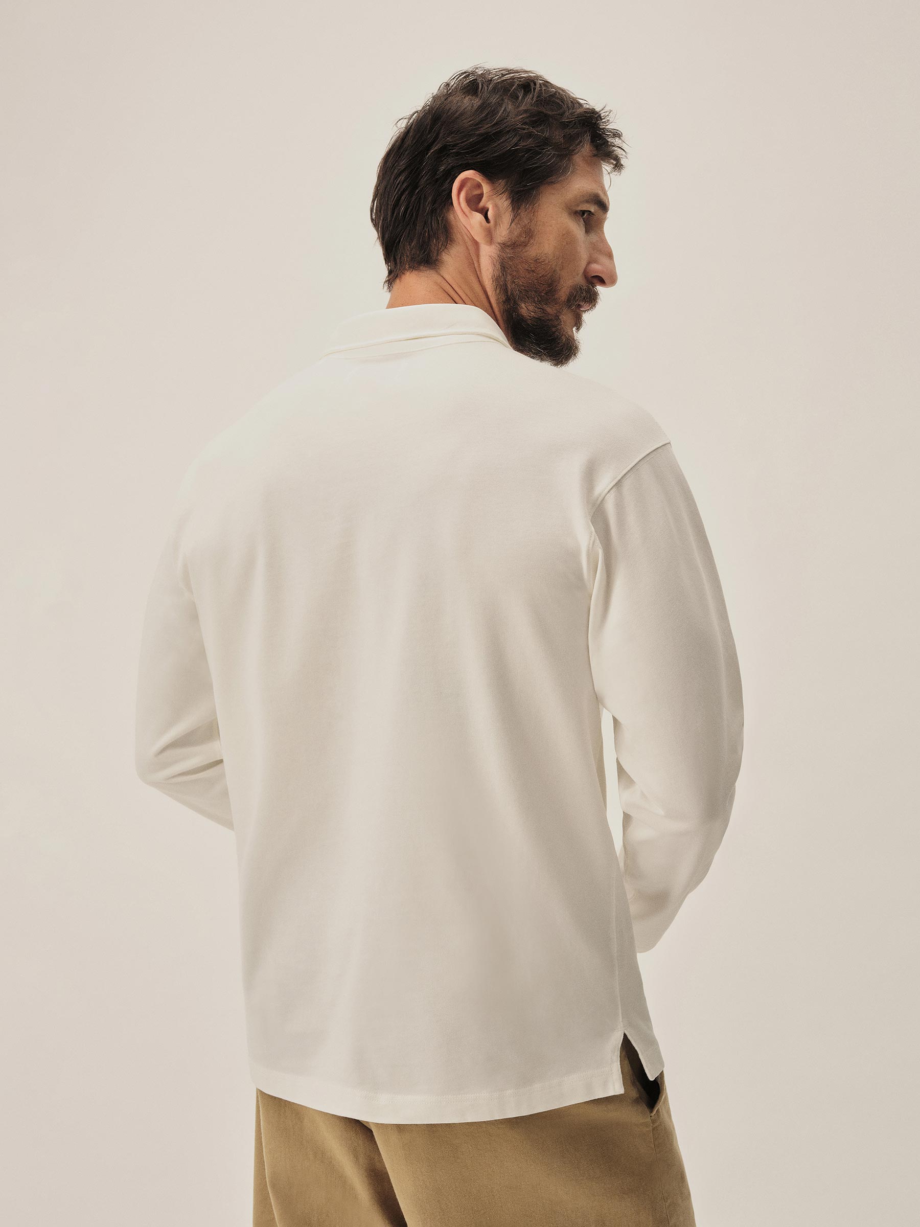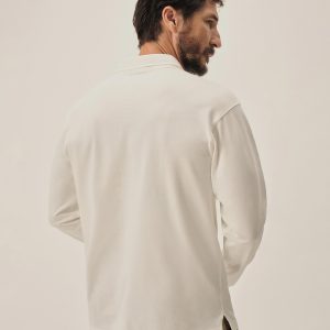 A popover shirt made from a midweight compact cotton jersey with a smooth, uniform texture and cool hand. It features a traditional shirt collar with a four-button half placket and single chest pocket. Ribbed sleeve cuffs.