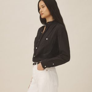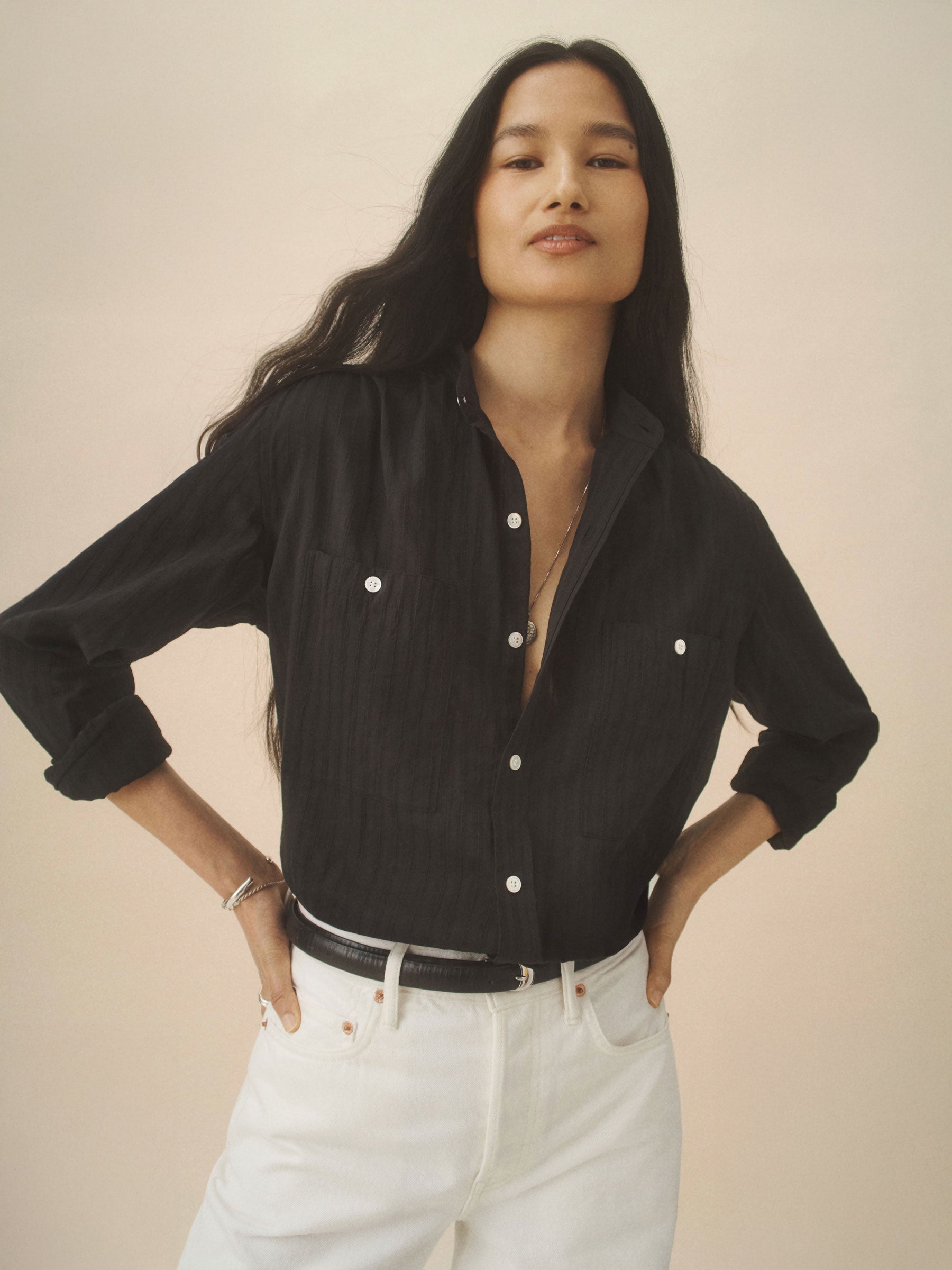 Relaxed-fit sheer shirt made from breathable 80-GSM cotton for a comfortable and airy feel. Featuring shirring at the shoulders and cuffs, a back yoke, and two chest pockets with button closures. Finished with mother of pearl buttons, button-through cuffs, and felled seams. Garment washed for a soft, worn-in feel.