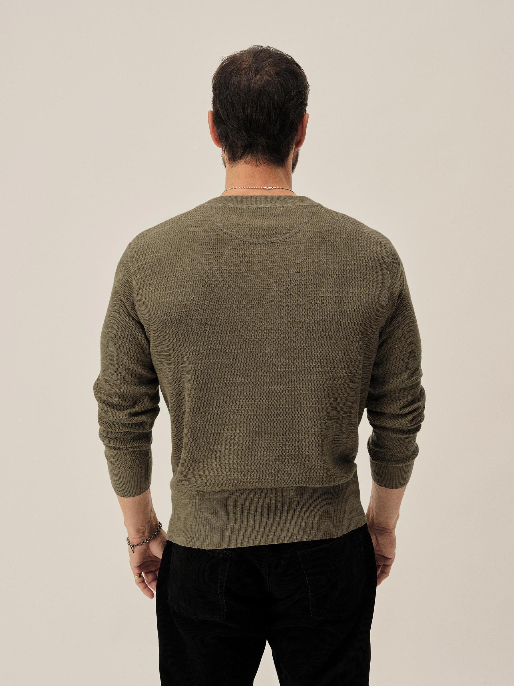 A standard fit, vintage-inspired thermal stitch henley crafted from slubby, yarn-dyed cotton. Featuring variegated rib finishes at the cuffs and bottom hem, and coverstitching along the seams. Finished with a three button shell closure.