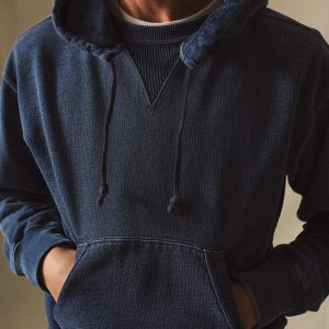 Classic fit 1940s style pullover hoodie cut from dense, indigo yarn-dyed 540 GSM cotton French terry. Softly structured and warm, the indigo will fade and pick up a ton of character with wear. Garment washed for a lived-in feel.