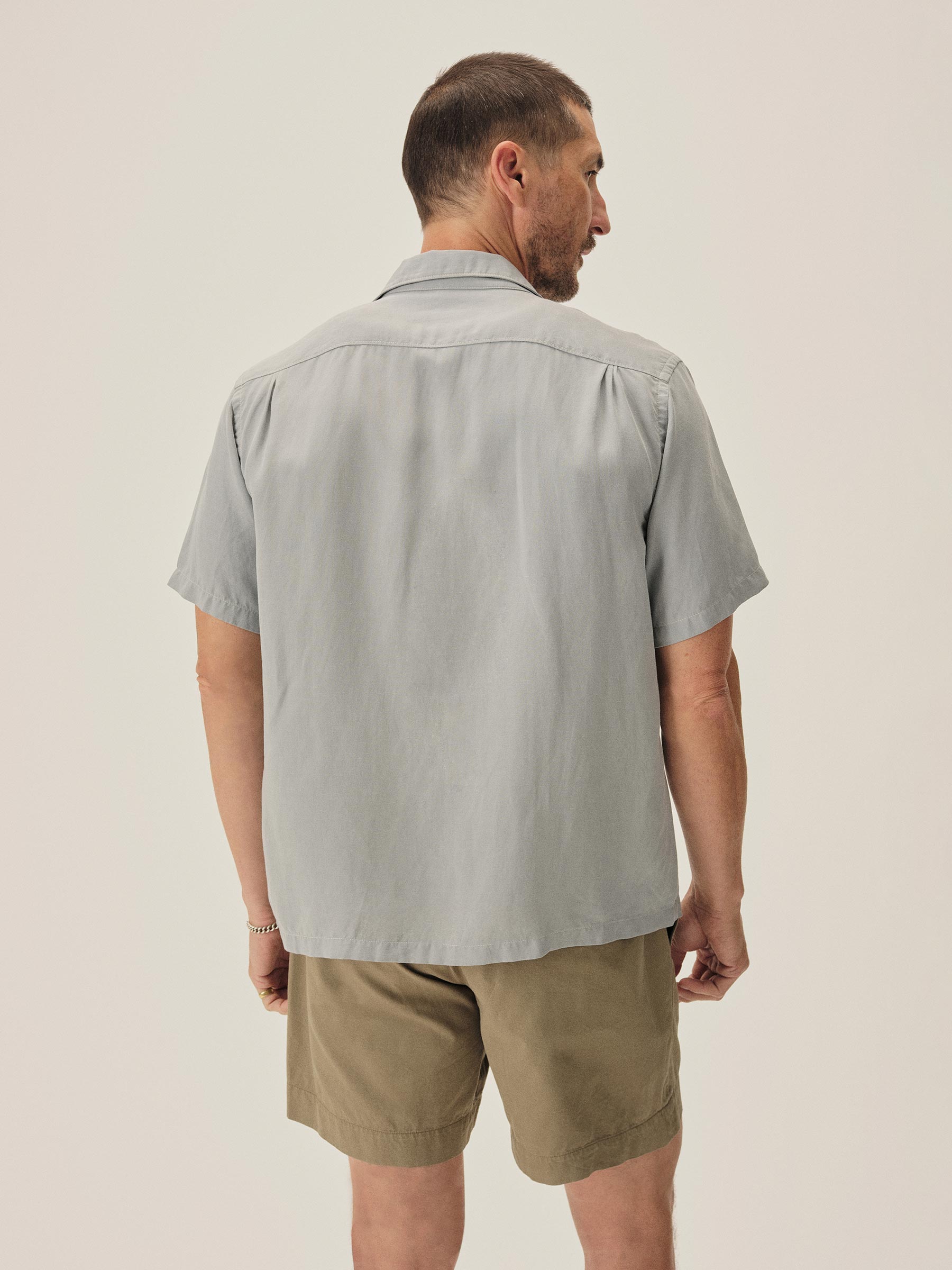 Classic fit short sleeve camp shirt cut from a 5.25 oz. yarn-dyed linen blend with a subtle luster and relaxed drape. Features a six-button placket with mother of pearl buttons, twin patch-and-flap chest pockets, straight hem, and a loop and button closure at the neck. Constructed with clean finished seams. Garment washed with enzymes for a lived-in feel.