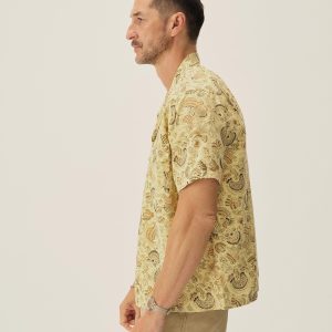 Classic fit short sleeve camp shirt cut from a 5.25 oz. yarn-dyed linen blend with a subtle luster and relaxed drape. Features a six-button placket with mother of pearl buttons, twin patch-and-flap chest pockets, straight hem, and a loop and button closure at the neck. Constructed with clean finished seams. Garment washed with enzymes for a lived-in feel.