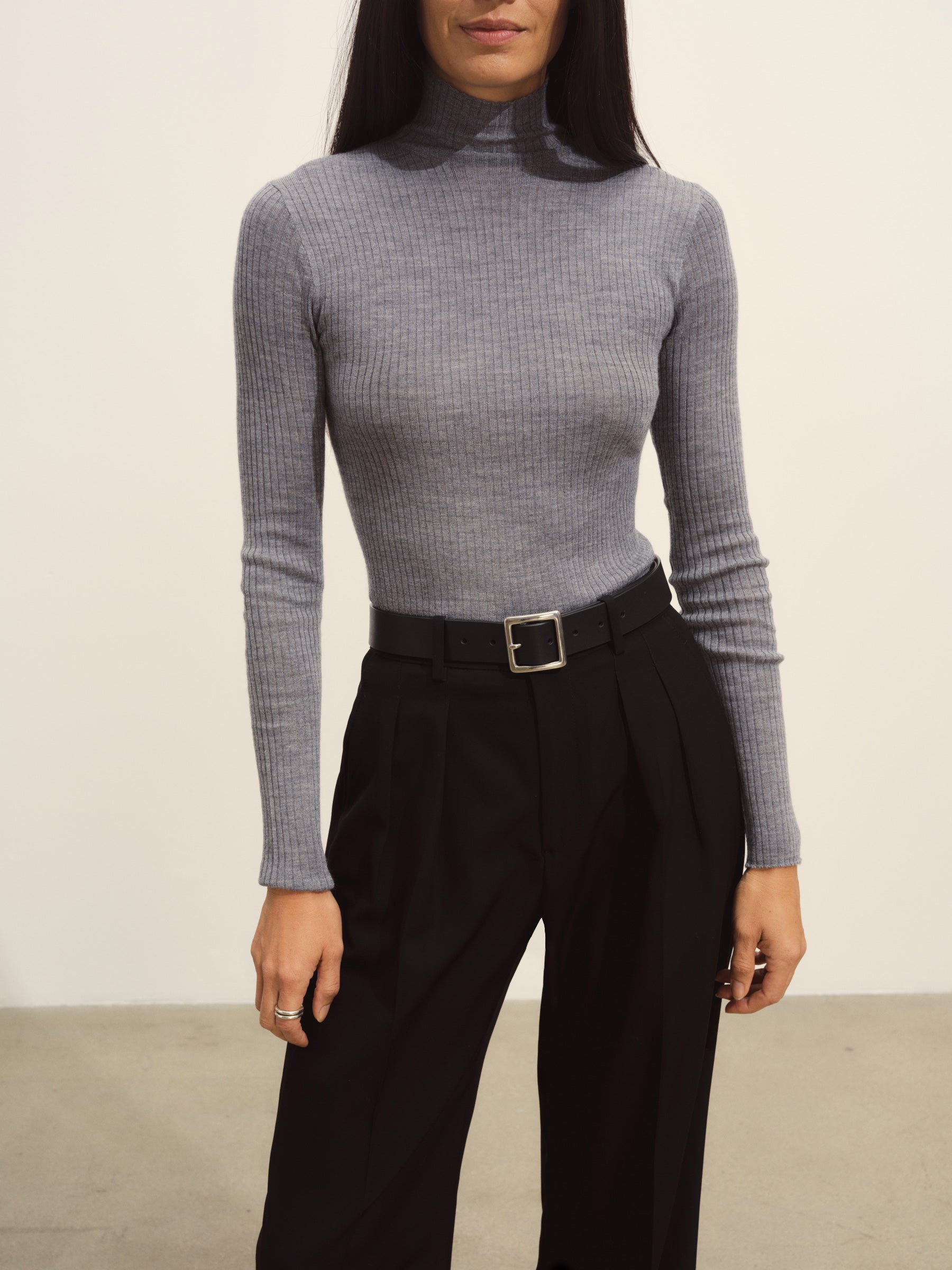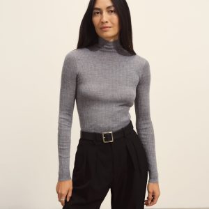 Slim fit turtleneck sweater in a 24″” length, elevated in a 14 gauge variegated rib knit from a blend of merino wool, silk, and cashmere. Luxe, easy, and ideal for layering. Constructed with self-starting hem and sleeve trim and fashioning at the neckline and back shoulder for durability.