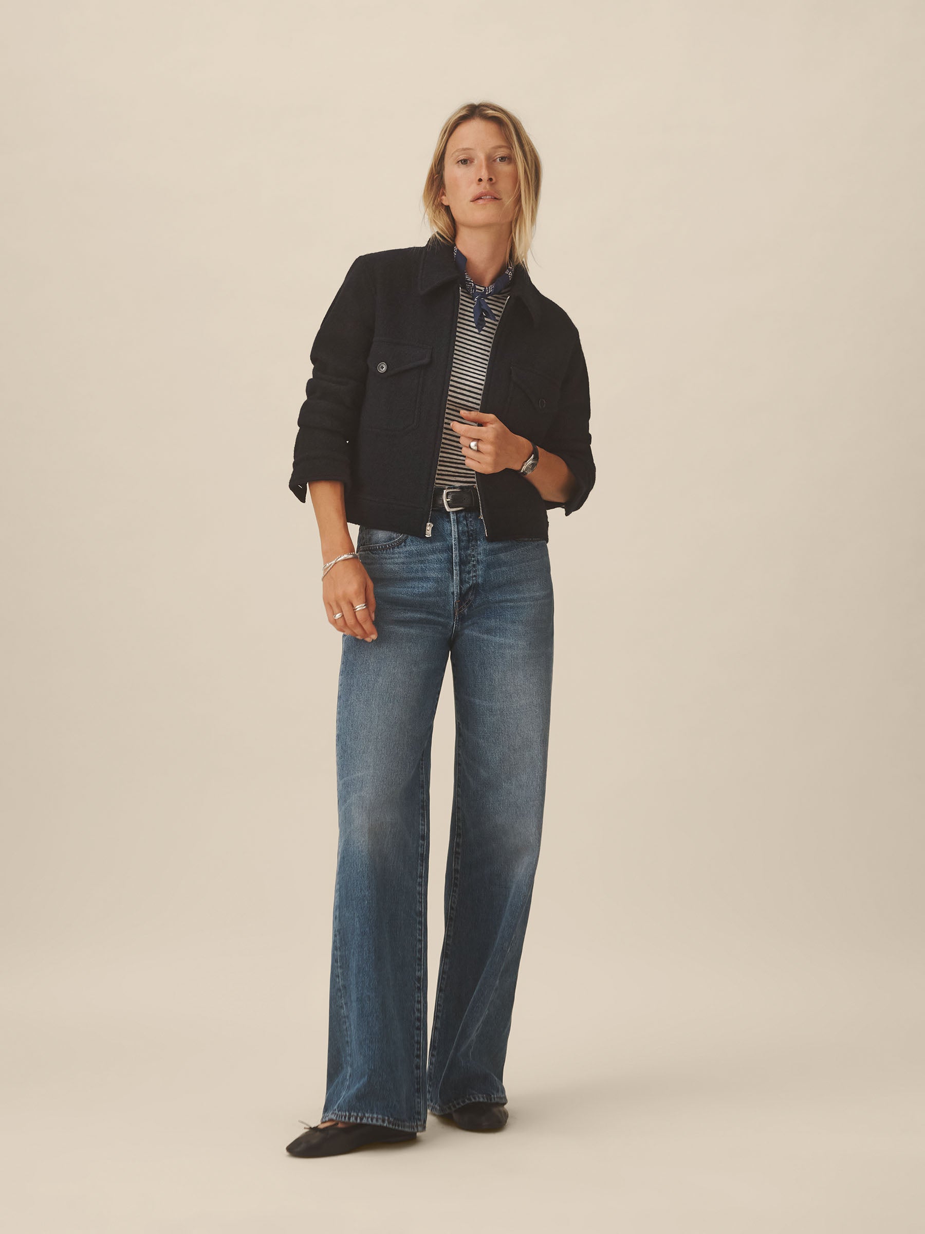 Relaxed utility jacket inspired by vintage mechanic uniforms. Cut from structured 340 GSM felted merino wool, twice boiled for improved insulation and durability. Details include a zipper front, chest pockets, and button-through cuffs. Back tabs can be adjusted for a more fitted waist.