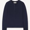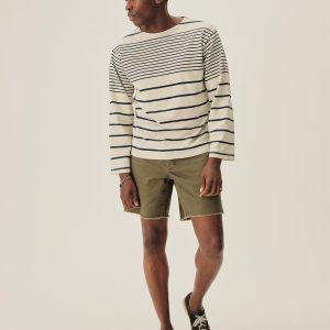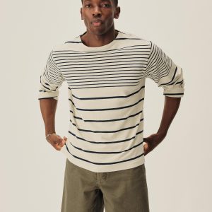 Nautical-inspired boxy fit short sleeve wide neck tee with a straight hem, longer sleeve length, drop shoulder, high neck, and wide ribbed collar. The soft cotton jersey, yarn-dyed in indigo and black sulfur stripe pattern, is about twice as heavy as our Pima tees, with tiny vertical ribs that gently glide across the skin. This is a solid, substantial stand-alone tee for cold weather that will pick up a ton of character over time.