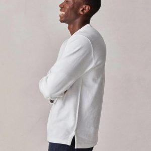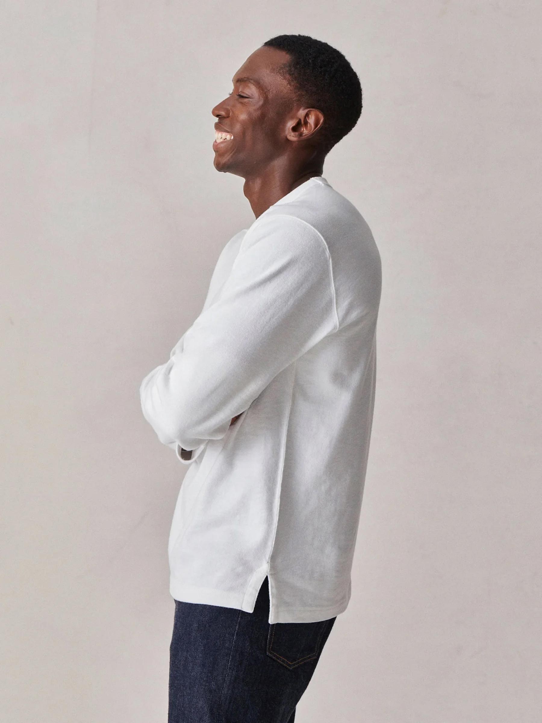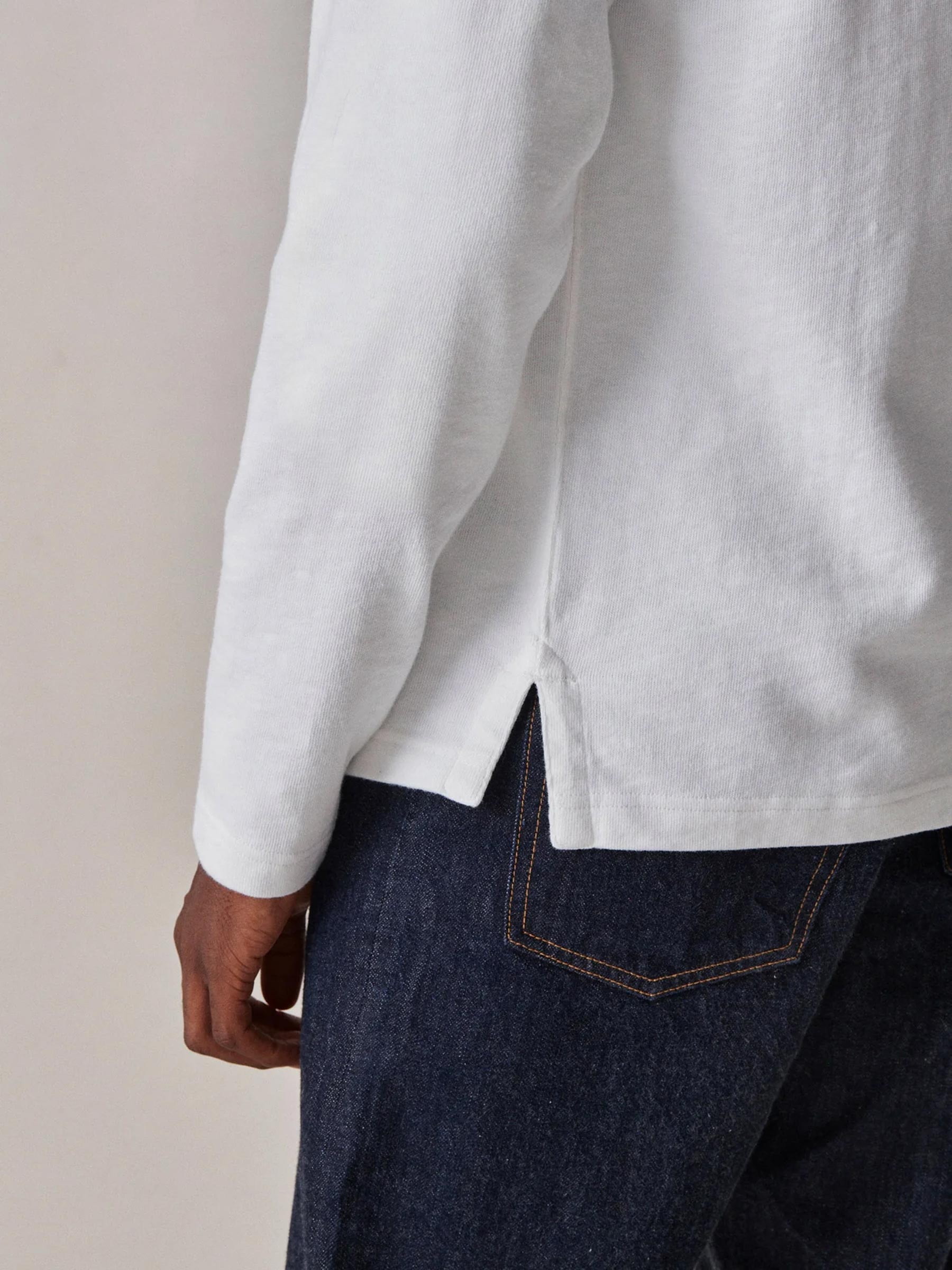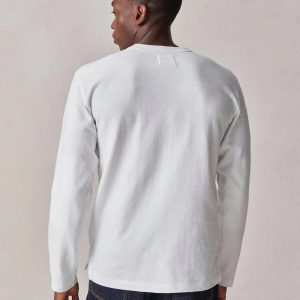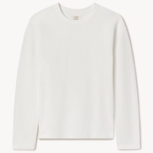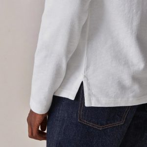 A relaxed, long-sleeved, heavyweight cotton tee modeled after a vintage rugby shirt. The soft cotton jersey is about twice as heavy as our Pima tee, with tiny vertical ribs that gently glide across the skin. This is a solid, substantial stand-alone tee for cold weather.