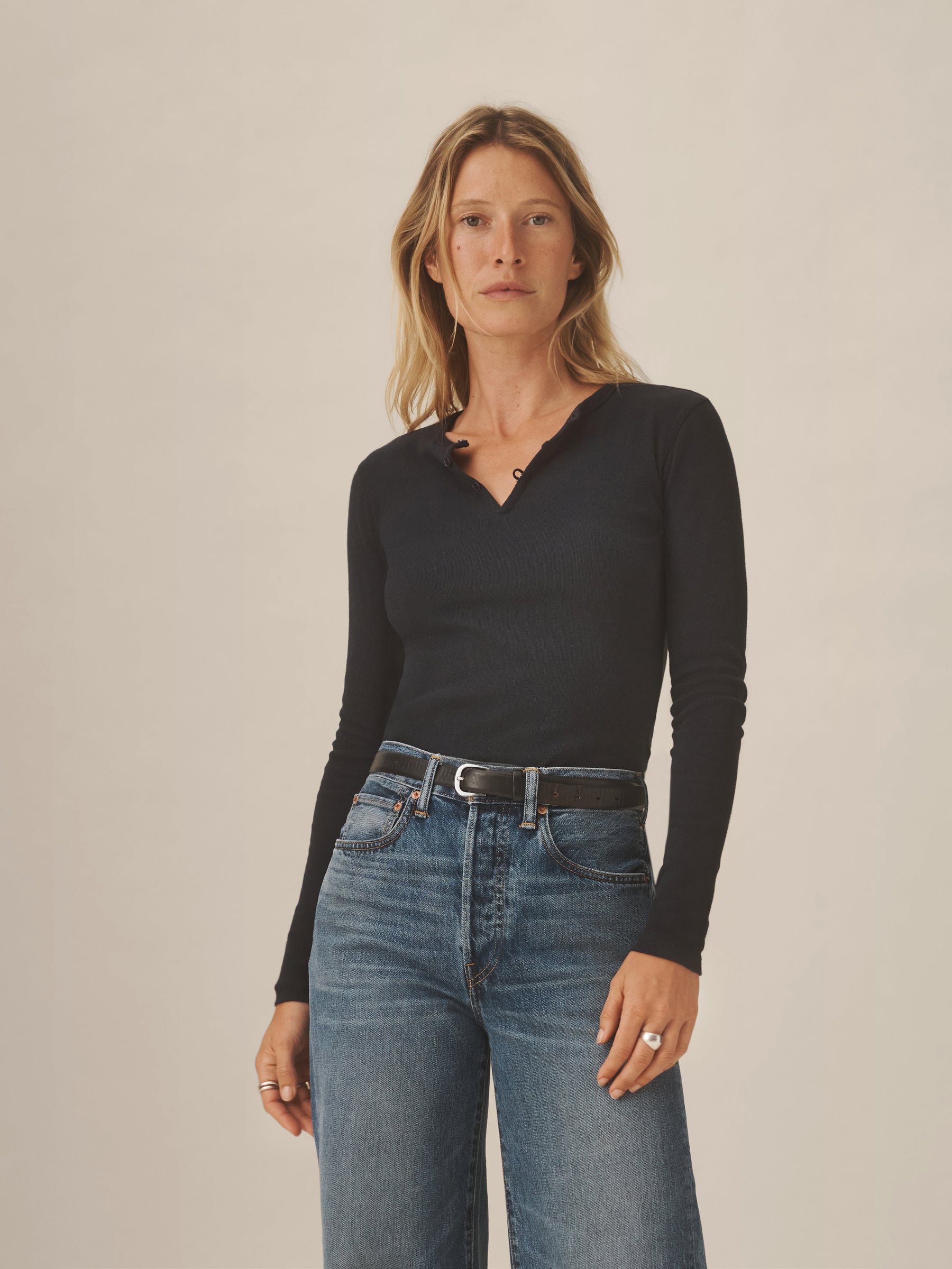 “Slim fit long sleeve henley cut from extra fine 170 GSM cotton with recycled content that holds its shape. Details include a a three-button loop placket with corozo fish eye buttons, and straight, clean finished hem and cuffs. Garment washed for a lived-in feel.