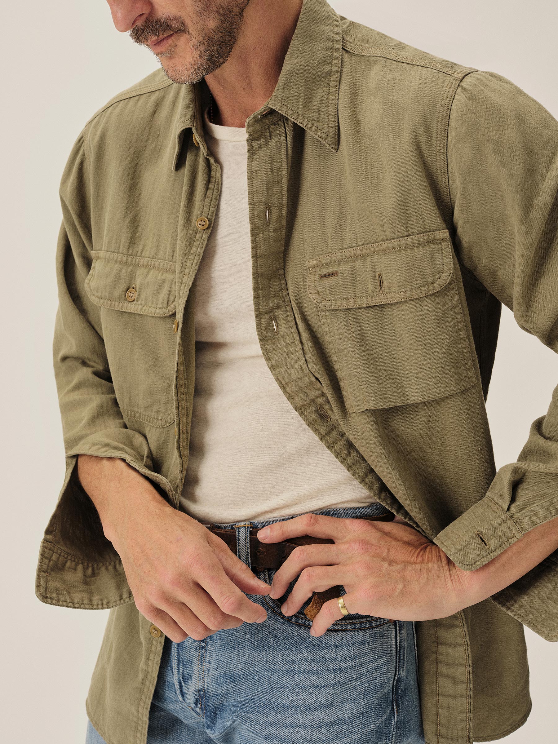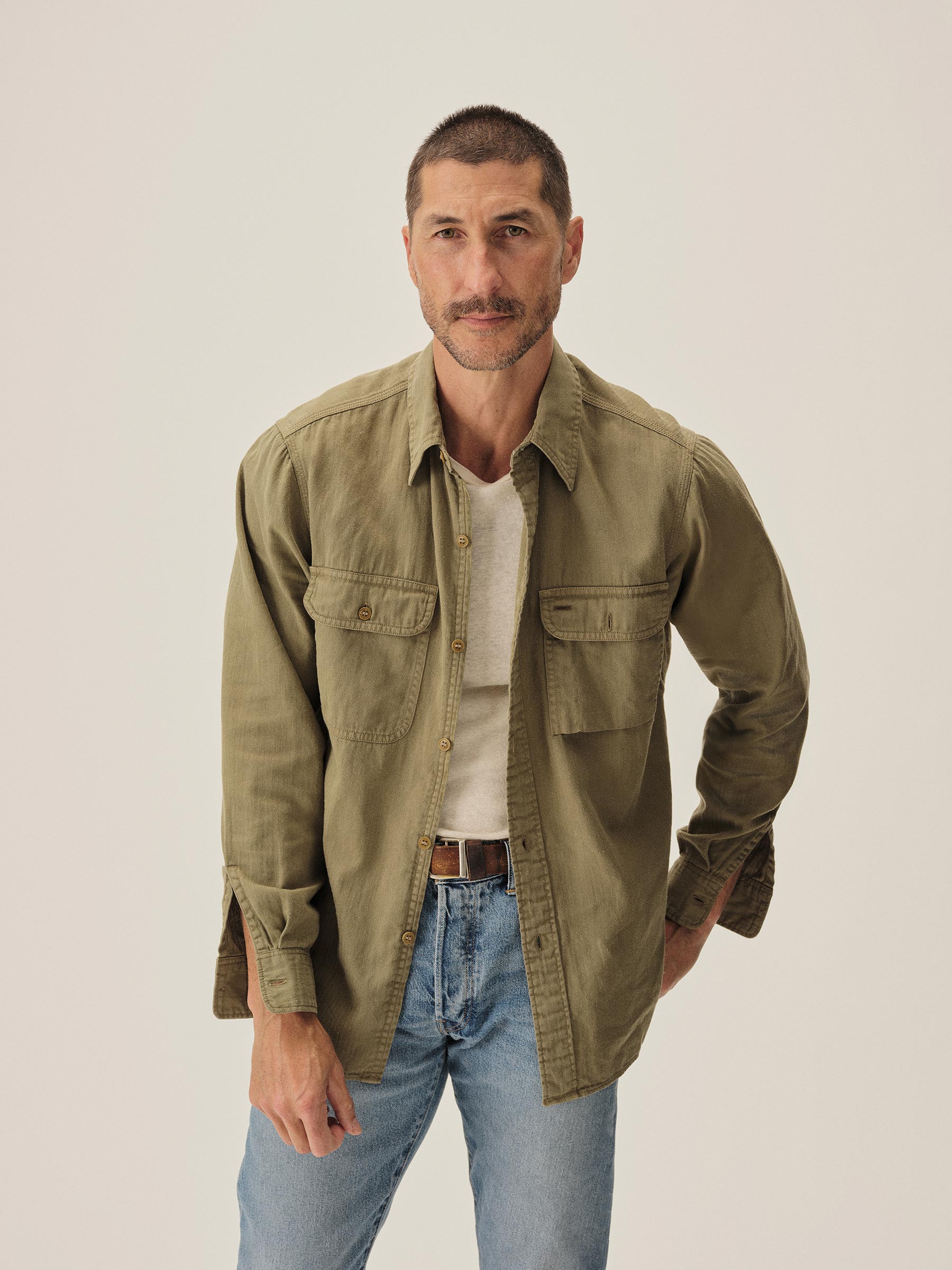 Born from the hardworking spirit of 1940s work shirts, the Soft Pack features a “cigarette pocket” at the chest and a narrow under-placket. Cut from a midweight, garment-dyed cotton/hemp HBT, and finished with a sun-fade effect, this shirt carries the weight of time.