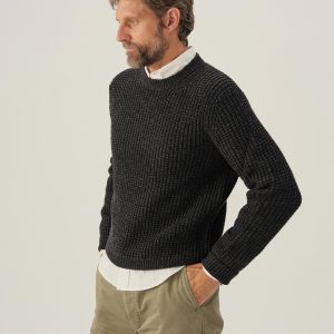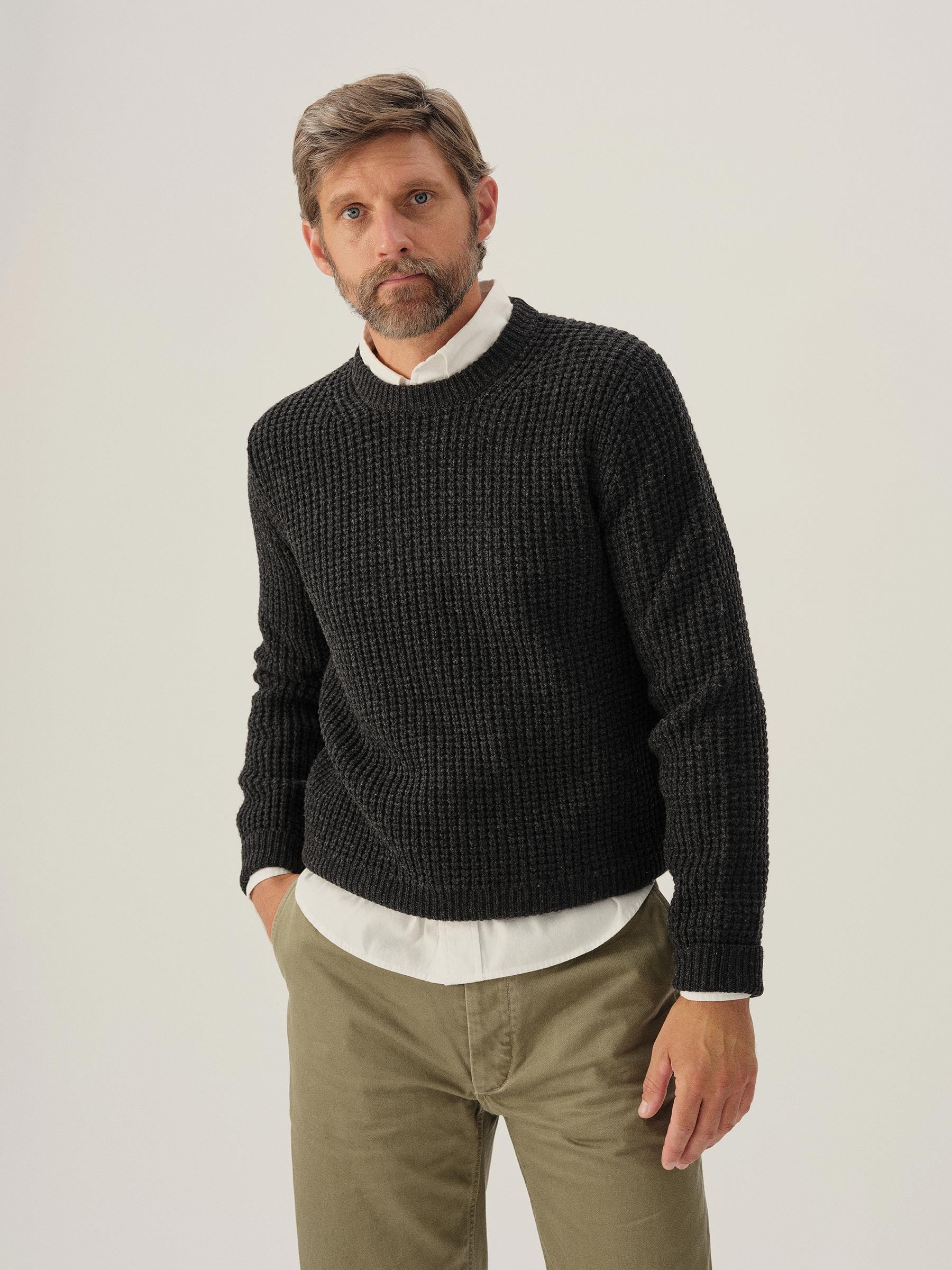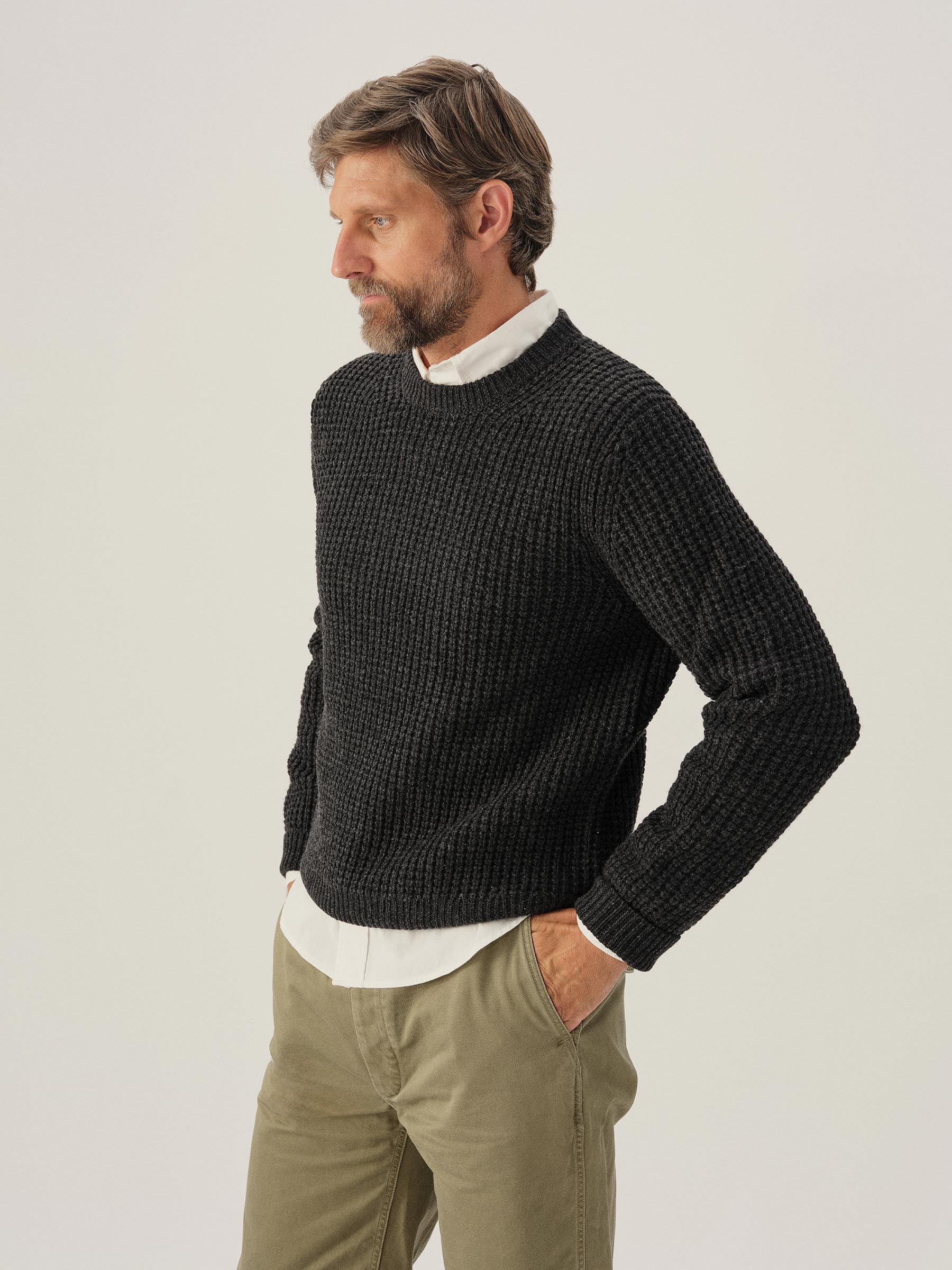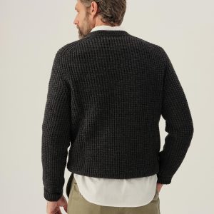 Classic crewneck waffle-knit from 5 gauge wool: a chunky, substantial yarn that’s soft to the touch. 95% Merino wool for warmth and durability, rounded out with 5% cashmere for added smoothness. The result: all the warmth, zero itch. Saddle shoulder for a comfortable fit with rib fashioning on the collar, cuffs, and hems.