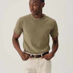 90s-inspired boxy fit short sleeve crewneck tee with a spade chest pocket, straight hem, longer sleeve length, drop shoulder, high neck, and wide ribbed collar. Bound neck for comfort, constructed with a split-needle cover stitch at shoulders and armholes. Cut from a cotton hemp blend; each yarn is dipped in an indigo dye bath before knitting. Garment washed for a softer lived-in feel.