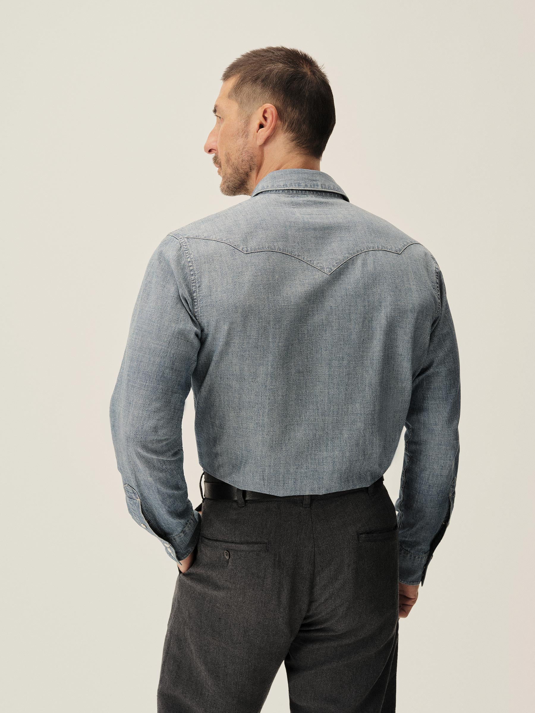 A classic western-style workshirt in a washed cotton chambray. The shirt has all cowboy details like pearl snap closures, curved western yoke, scalloped flap pockets, and three snaps along the cuffs. The blue chambray cotton has been washed for a lived-in feel.