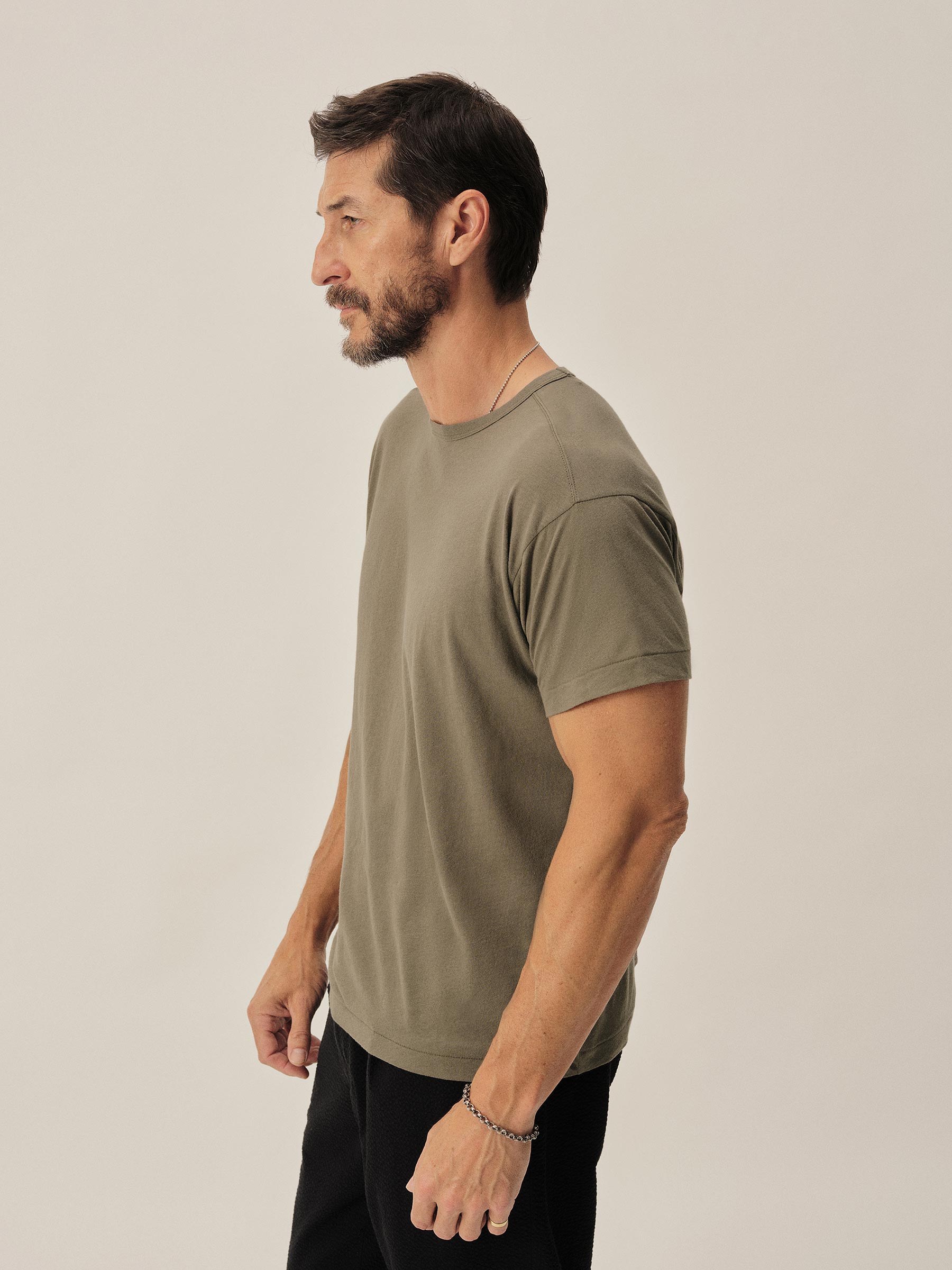 Crafted from a custom-spun, super fine 56 singles blended cotton-linen yarn, spun and knit exclusively in Japan. This fabric is designed to combine the smoothness of a premium yarn with the subtle texture of something more rugged. The result is a tee that’s smooth, cool, and light as air with a subtle silky hand feel. Finished with a rib-bound crewneck, blind hems at the sleeves and bottom, and overlocked seams.