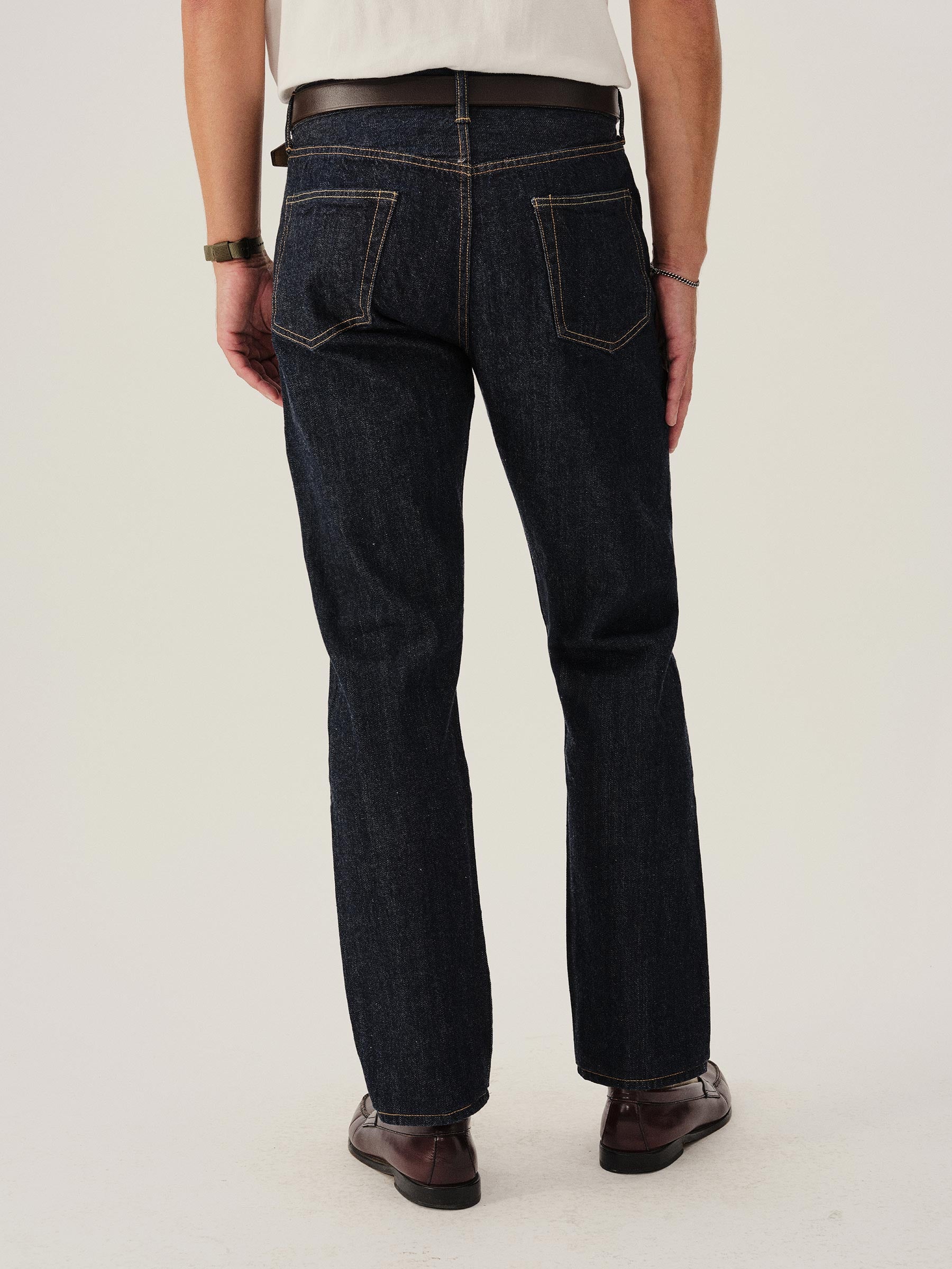 A classic 5-pocket jean in our Ford Standard fit: mid-rise, straight through the thigh with a taper below the knee. Inspired by blue jeans from the 1940s through the 1960s, this shuttle loomed 14 oz. selvedge denim is unsanforized, and has an organic texture that develops more character with every wear. Garment rinsed for a lived-in feel. Details include copper rivets and a metal tack button fly.