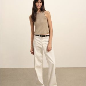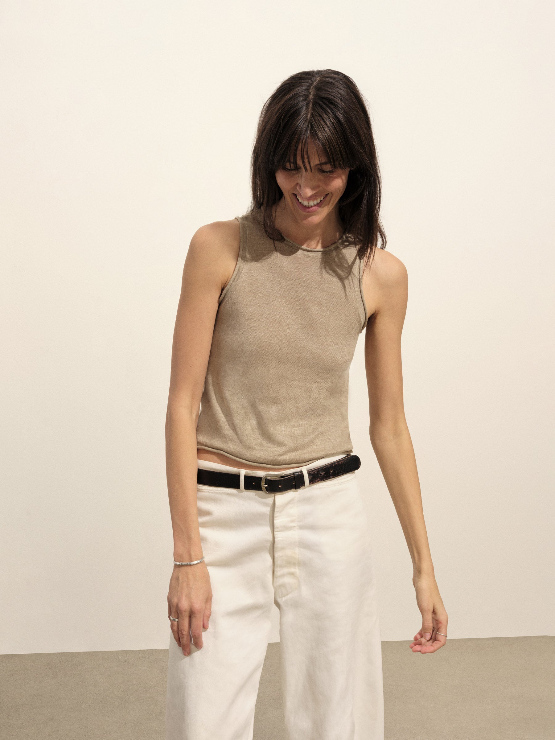 Oversized rollneck sweater-tank knit from textured linen, featuring a high neckline and a concealed thread-chain and snaps at each shoulder to hold bra straps in place. Garment washed for a soft, textured feel.