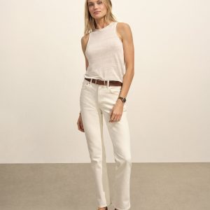 Oversized rollneck sweater-tank knit from textured linen, featuring a high neckline and a concealed thread-chain and snaps at each shoulder to hold bra straps in place. Garment washed for a soft, textured feel.