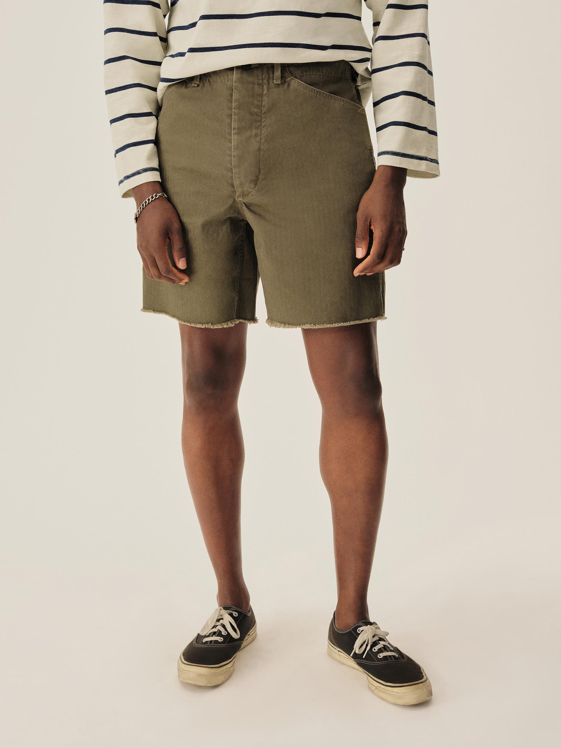 Our homage to WWII-era military-style fatigue cut-offs. Cut in a true-to-original relaxed fit with a slightly higher rise and roomy thigh, in a lightly structured 9.4 oz. herringbone twill. Constructed with felled seams, patch-and-flap back pockets, and 13-star tack buttons — all authentic to the original WWII model. Garment-washed for a lived-in feel.