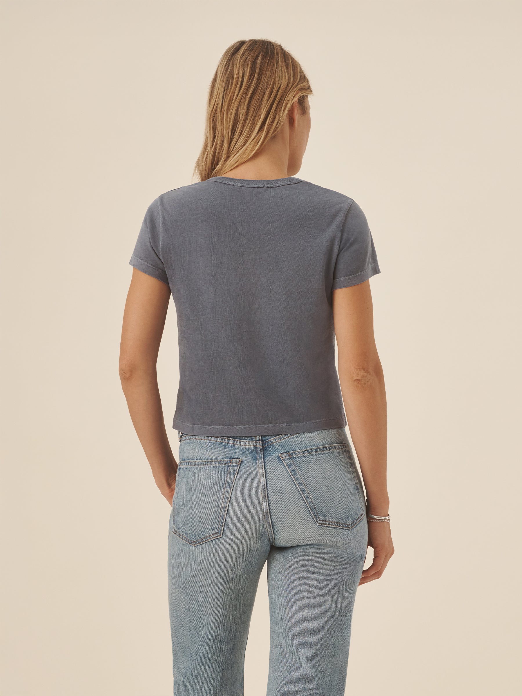 Boxy short sleeve crewneck tee with a straight hem. Cut from 120 GSM Supima cotton. Constructed with rib neck binding and double-needle cover-stitching at the hem. Garment washed for a lived-in feel.