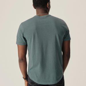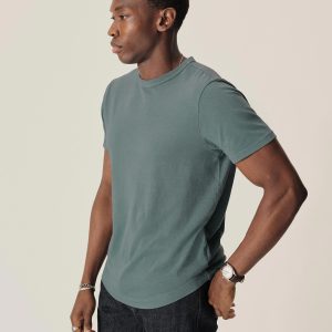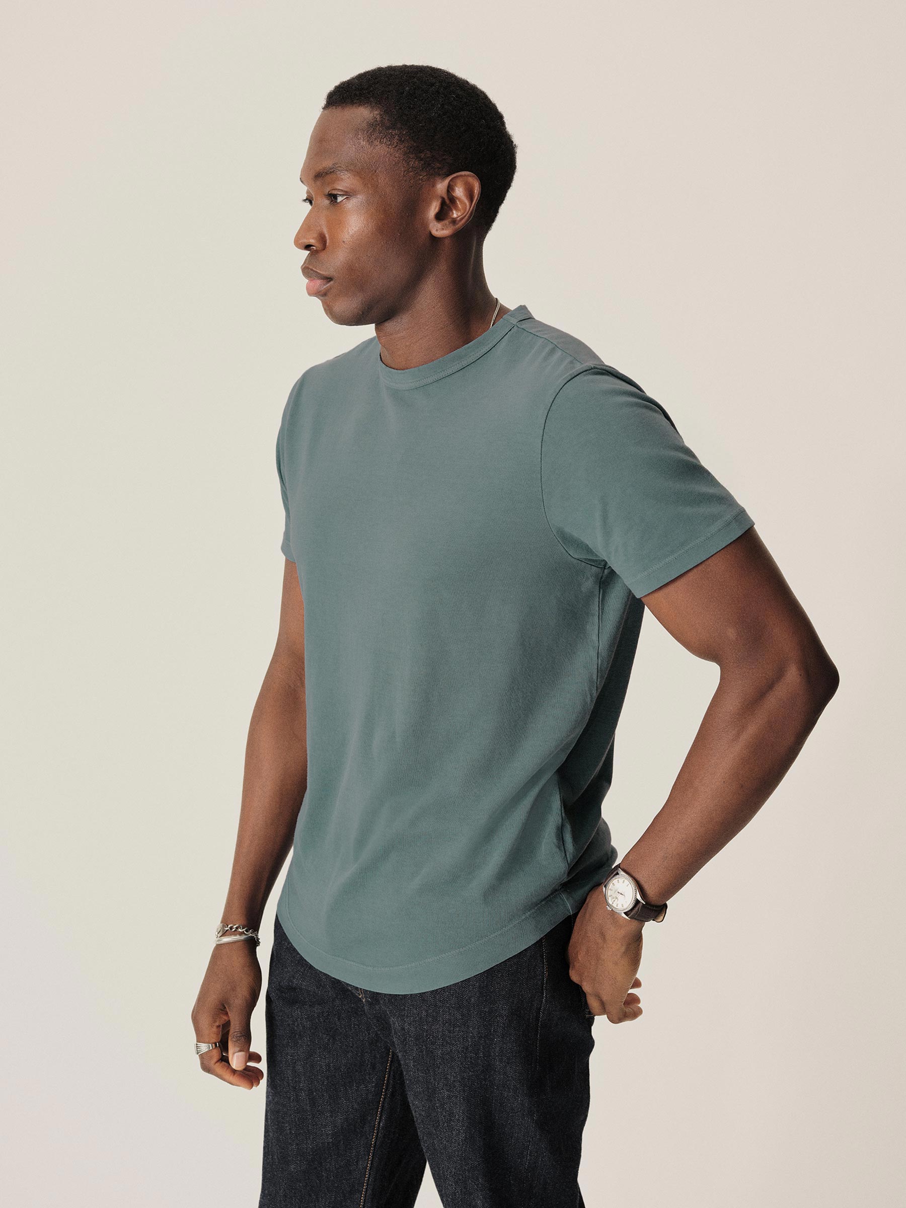 Classic fit short sleeve crewneck tee with our signature curved hem, cut from USA-grown and milled 140 GSM jersey knit from long-staple Supima cotton with a soft, smooth hand and sewn at BM Knitting Mills in Mohnton, PA. Constructed with self-neck binding and a flat stitch finish for comfort. Garment washed with enzymes and softener for a lived-in feel.