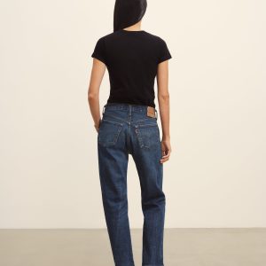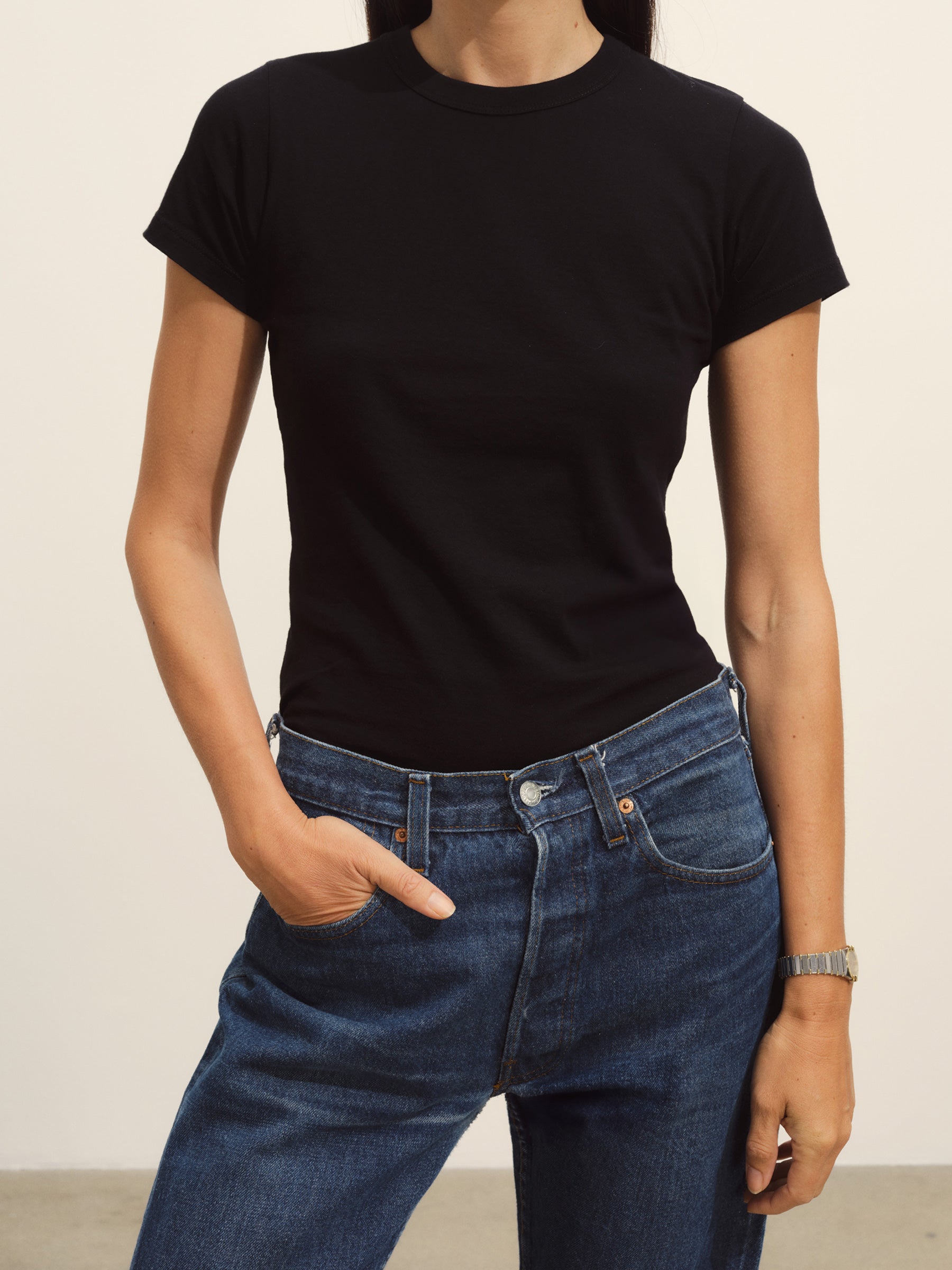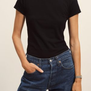 Slim fit short sleeve crewneck tee with a straight hem in 120 GSM jersey, knit from long-staple Supima cotton. Constructed with a durable rib stitch collar and double-needle cover stitch hem. Garment washed with softener for a lived-in feel.
