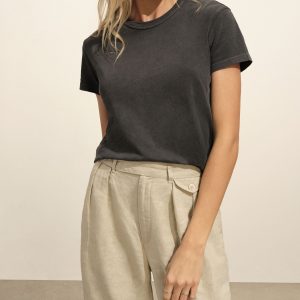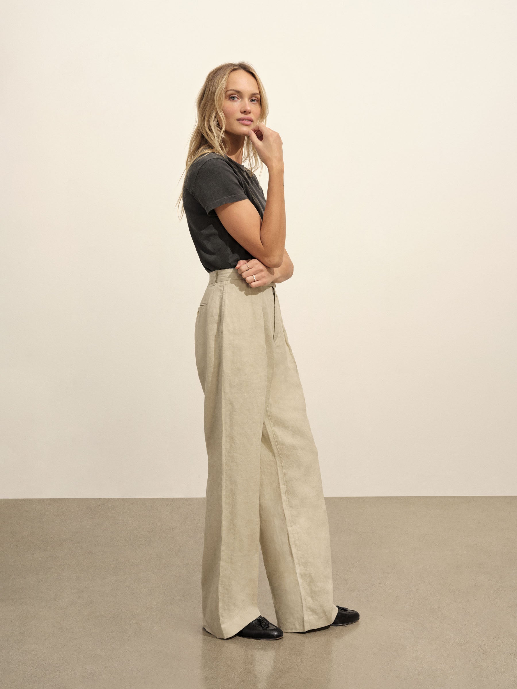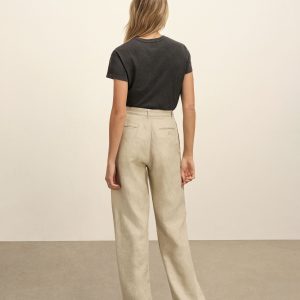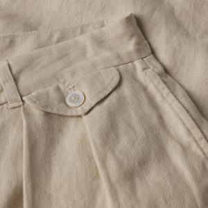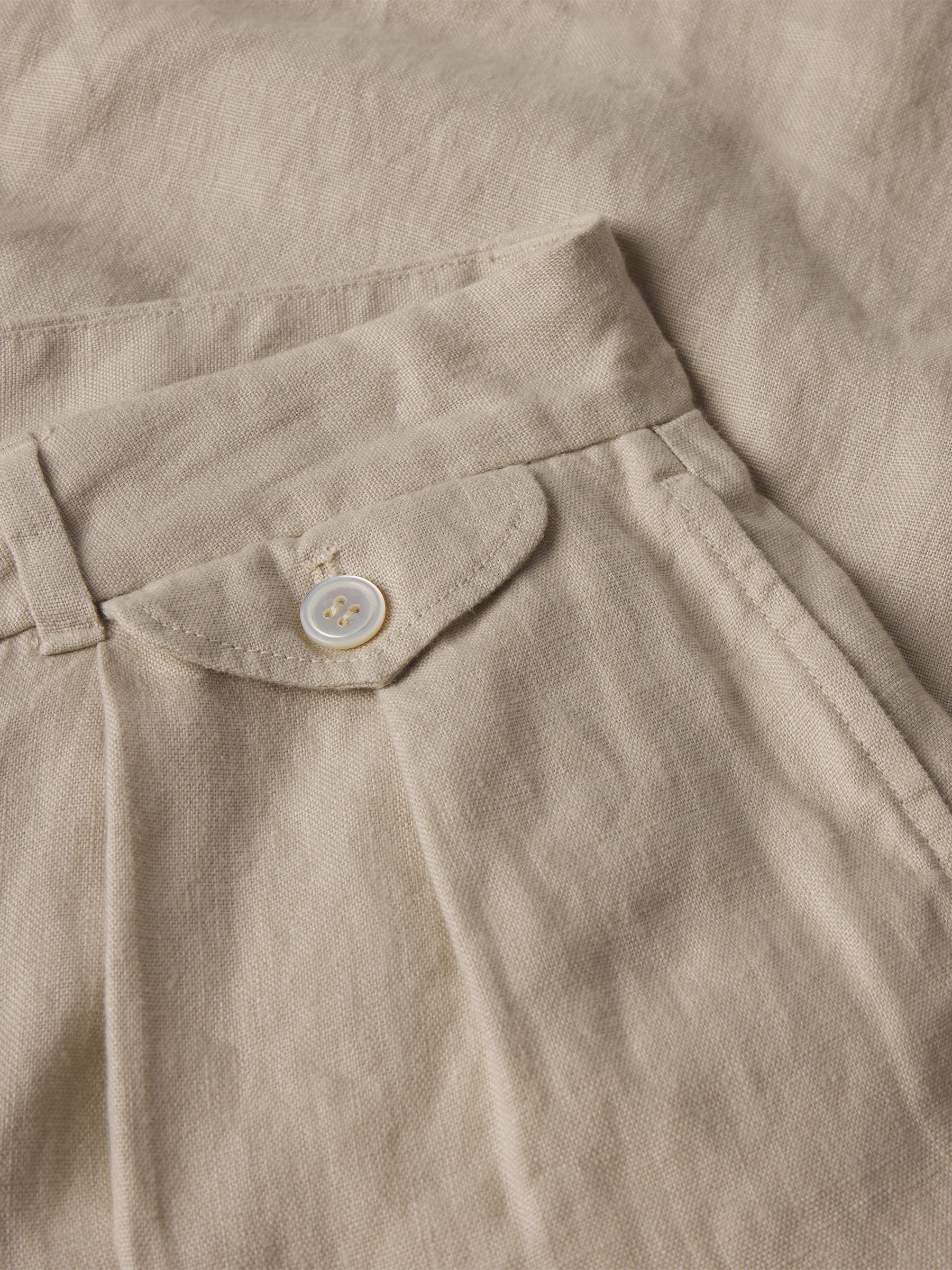 Taking inspiration from 1940s men’s tailoring, a pleated wide-leg trouser tailored for the modern woman, cut from 6.5 oz. linen. Featuring a 32.5” inseam with a mid-rise, a button-through waistband extension, a front coin pocket with button-through flap, and back welt pockets with a single button closure. Finished with mother of pearl buttons and a zipper fly. Garment washed for a truly vintage feel.