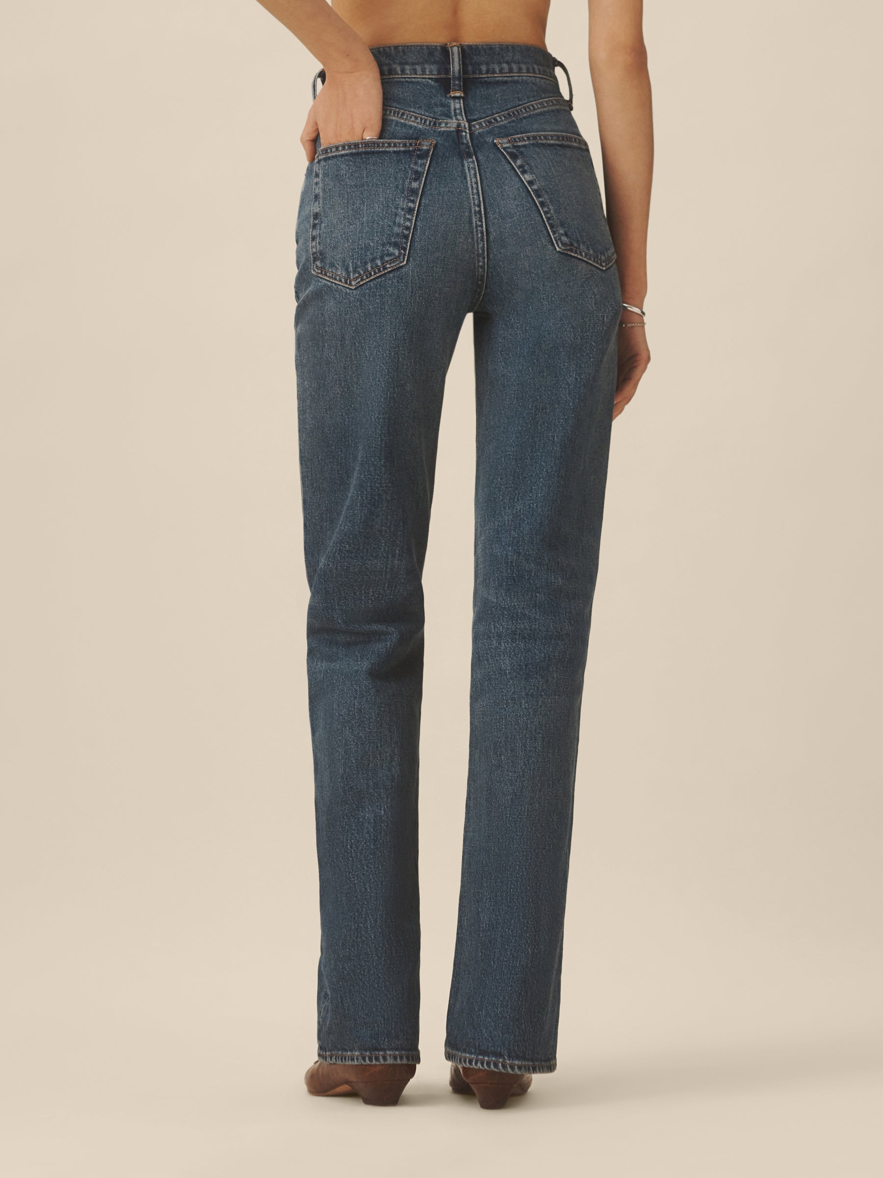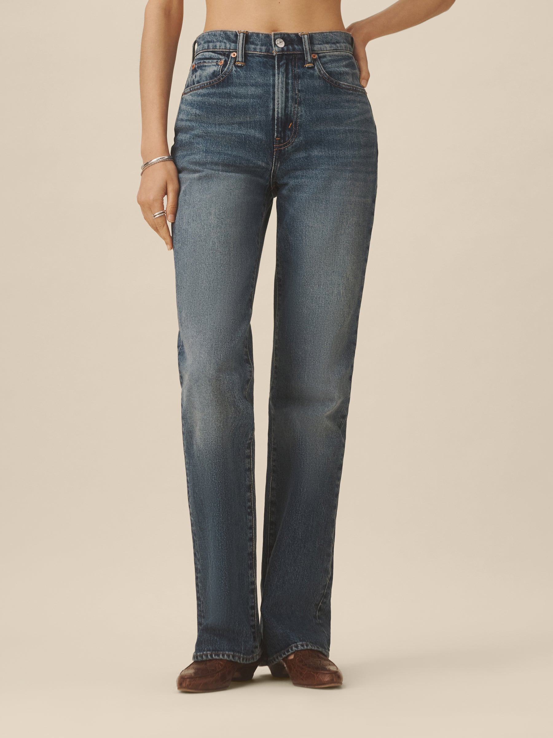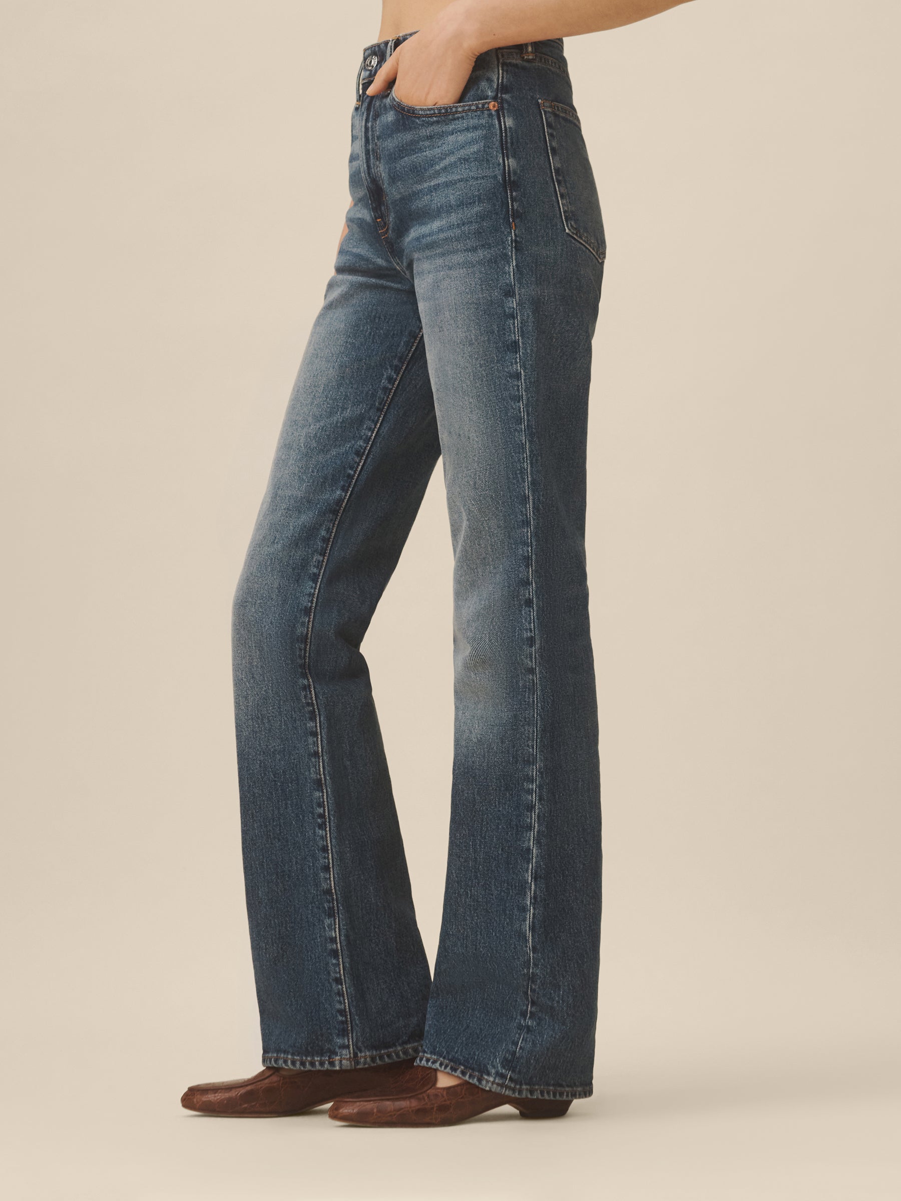 A high-rise boot jean built from Japanese indigo denim with subtle stretch, designed with classic five-pocket construction and a zip fly. Cut with a fitted top block, slight boot cut, and a 33″ inseam.