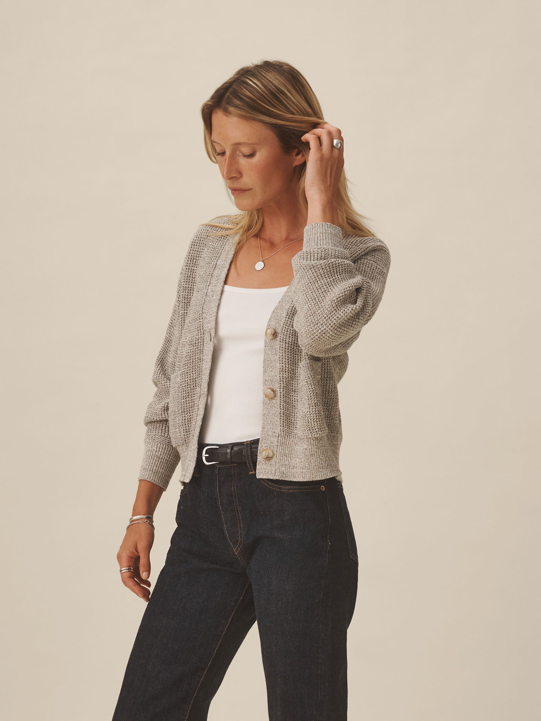 A relaxed cardigan made from marled cotton yarn and knit in a classic waffle stitch. Designed to layer over tees, it’s built with a functional front placket with urea buttons, patch pockets, and a clean V-neckline.