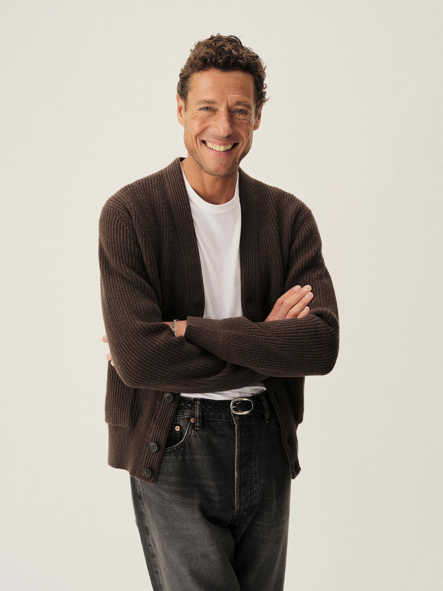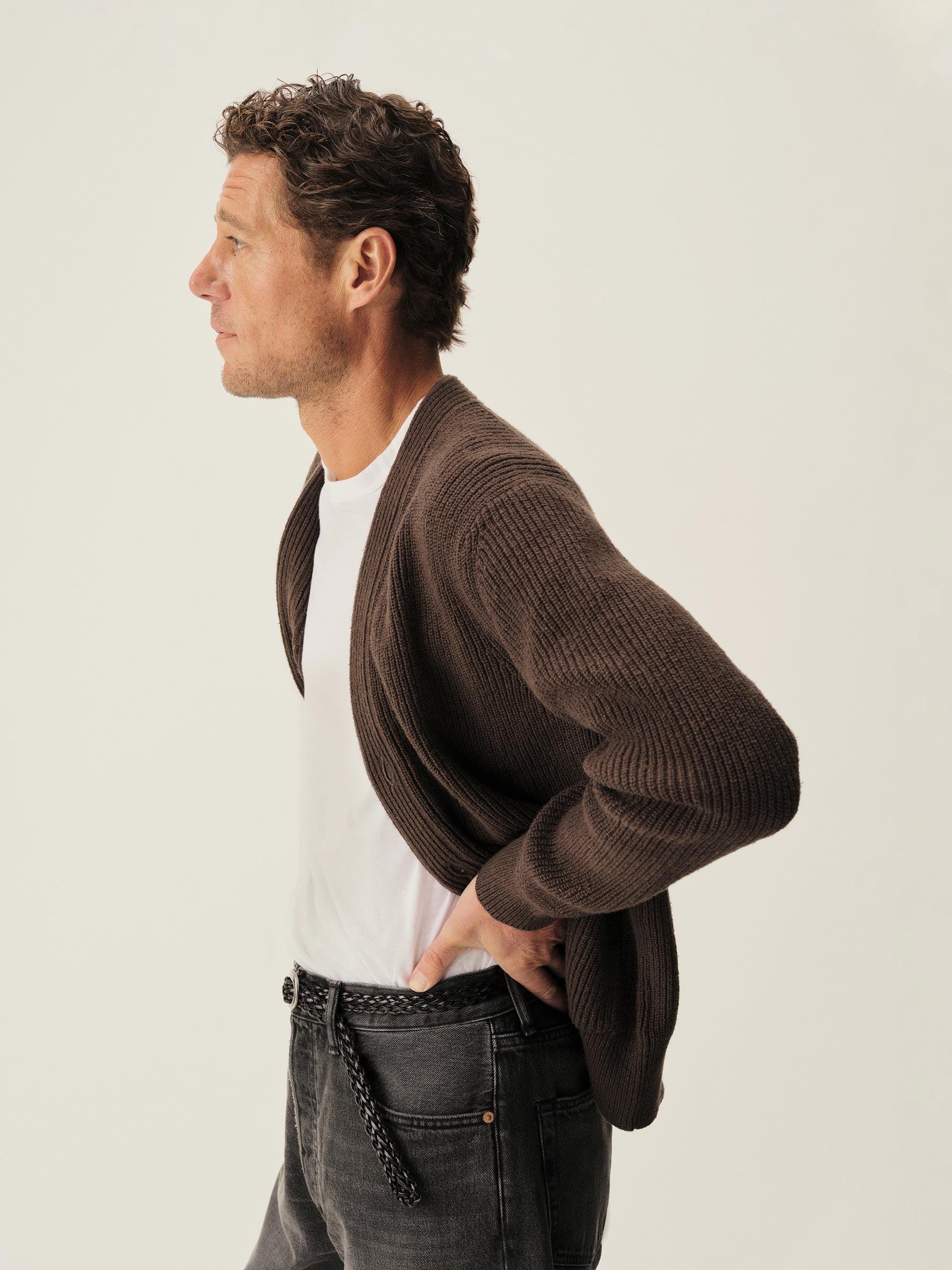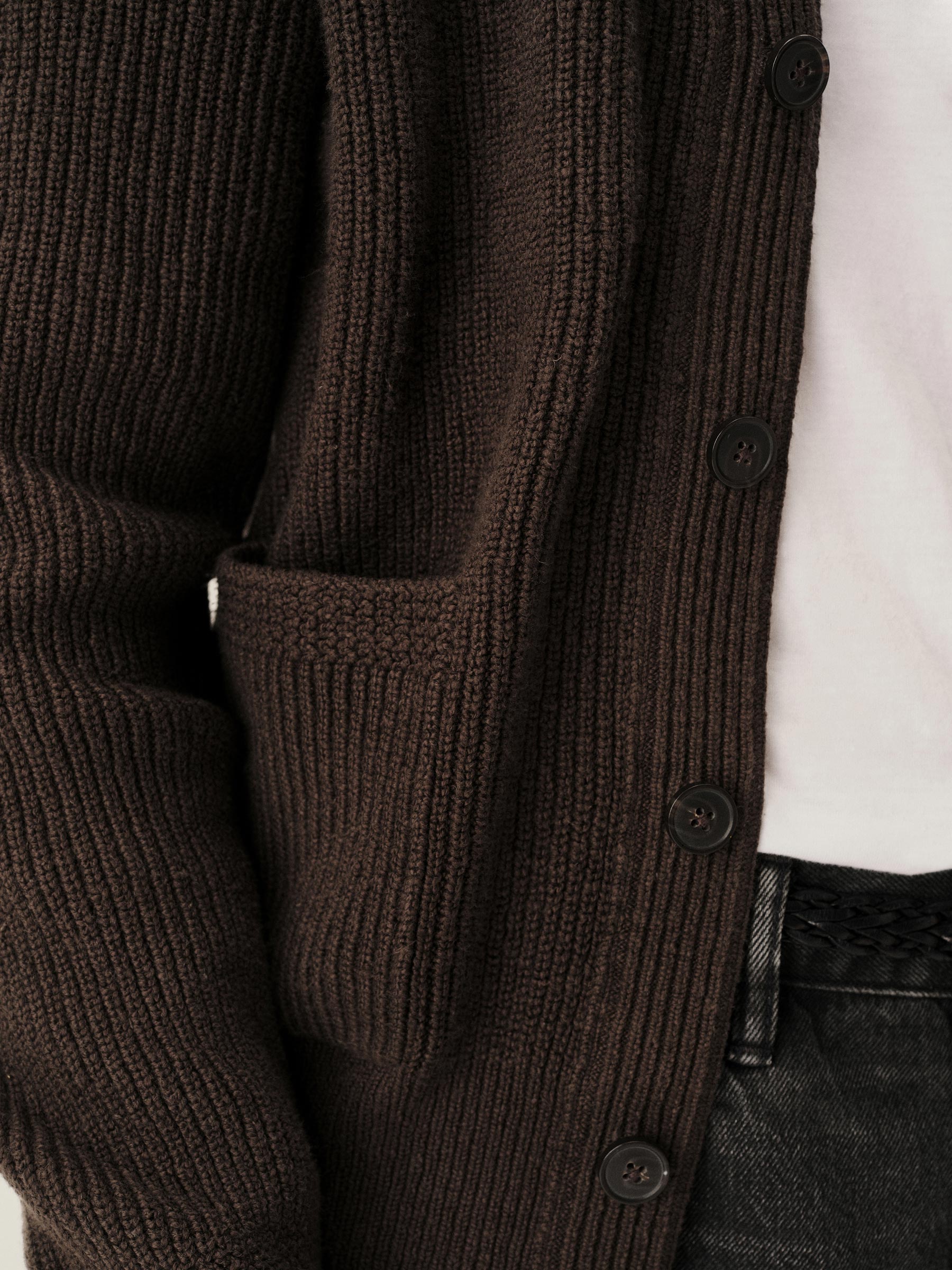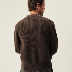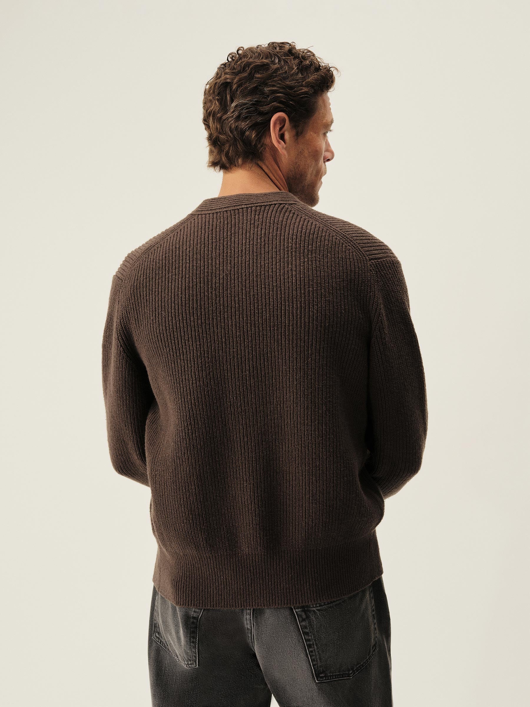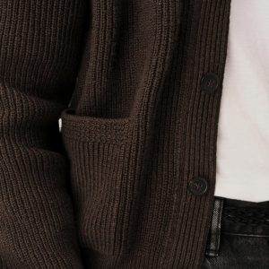 Classic fit fisherman’s cardigan sweater in a homespun textured cotton rib with two patch front pockets and a 5-button front closure. Constructed with hand-linked seams, double layer ribbing at the front placket, and racking stitch detailing at the cuffs.