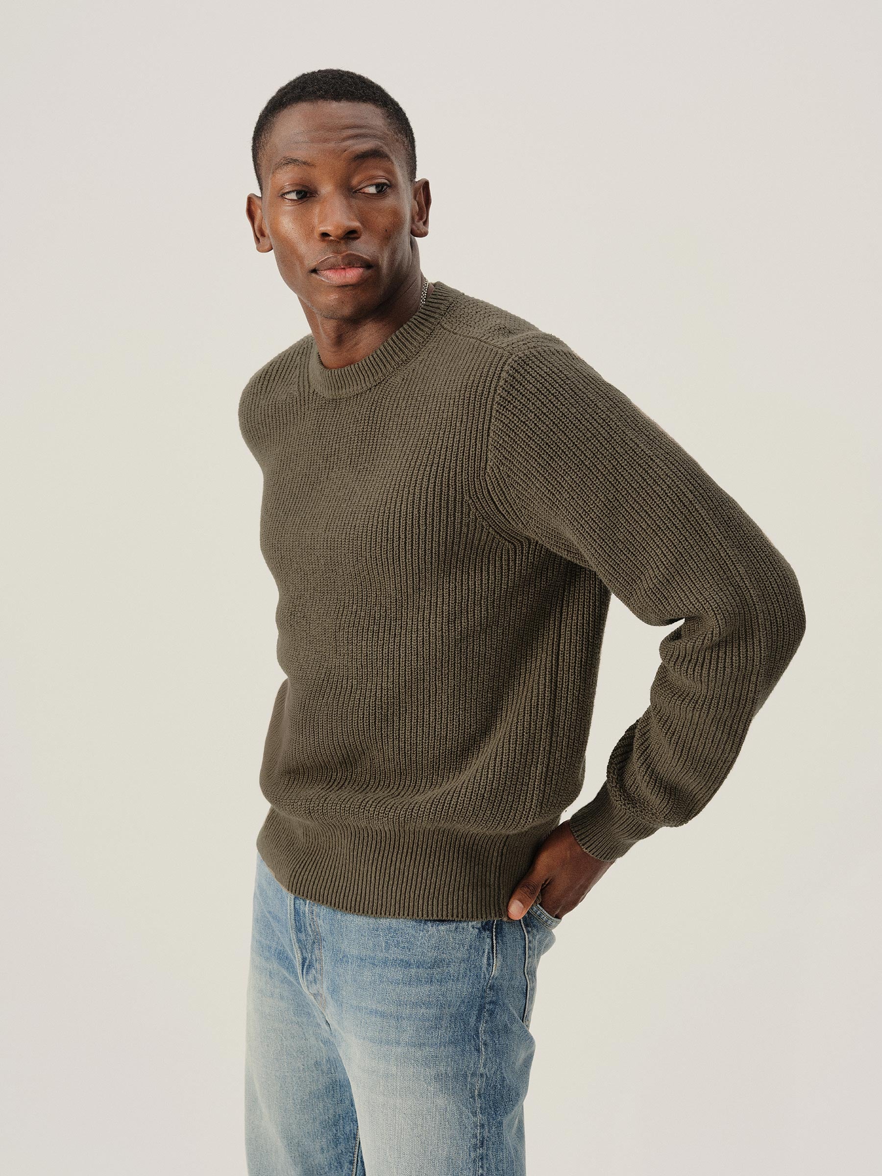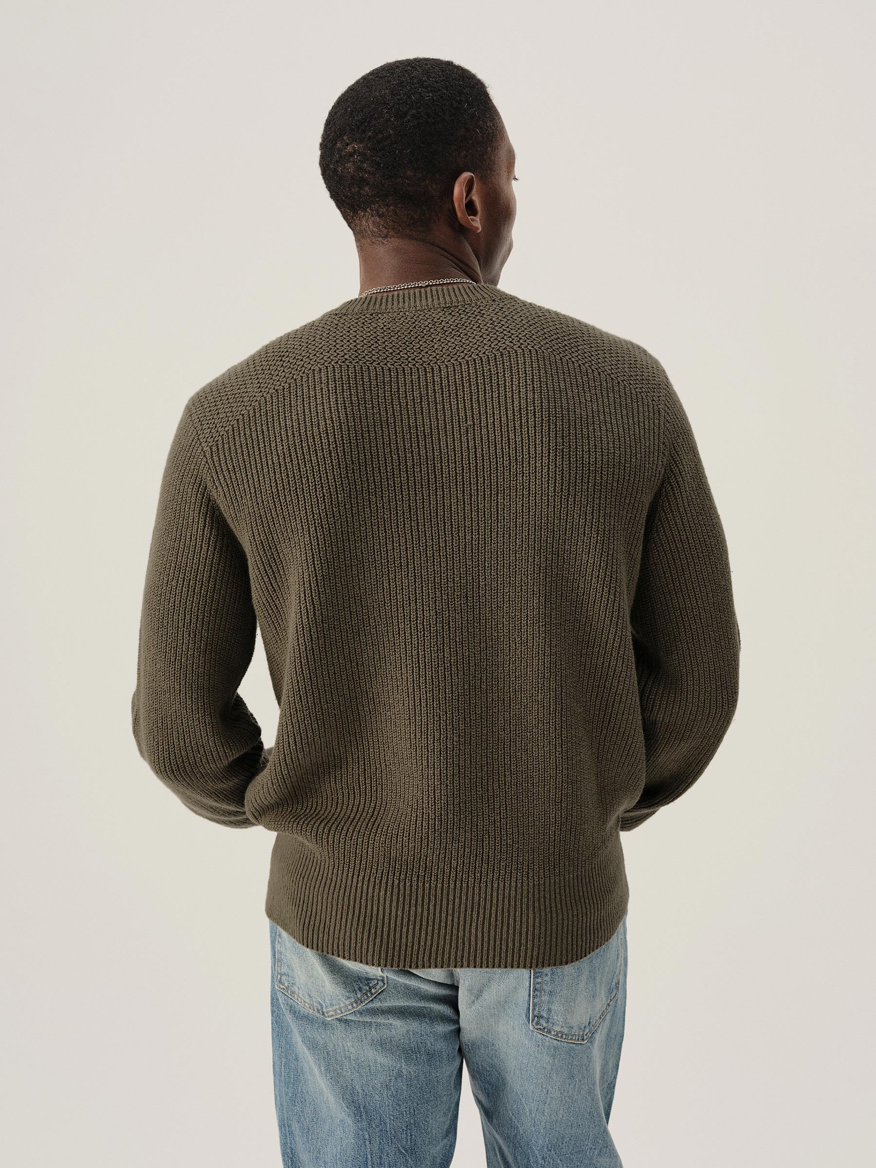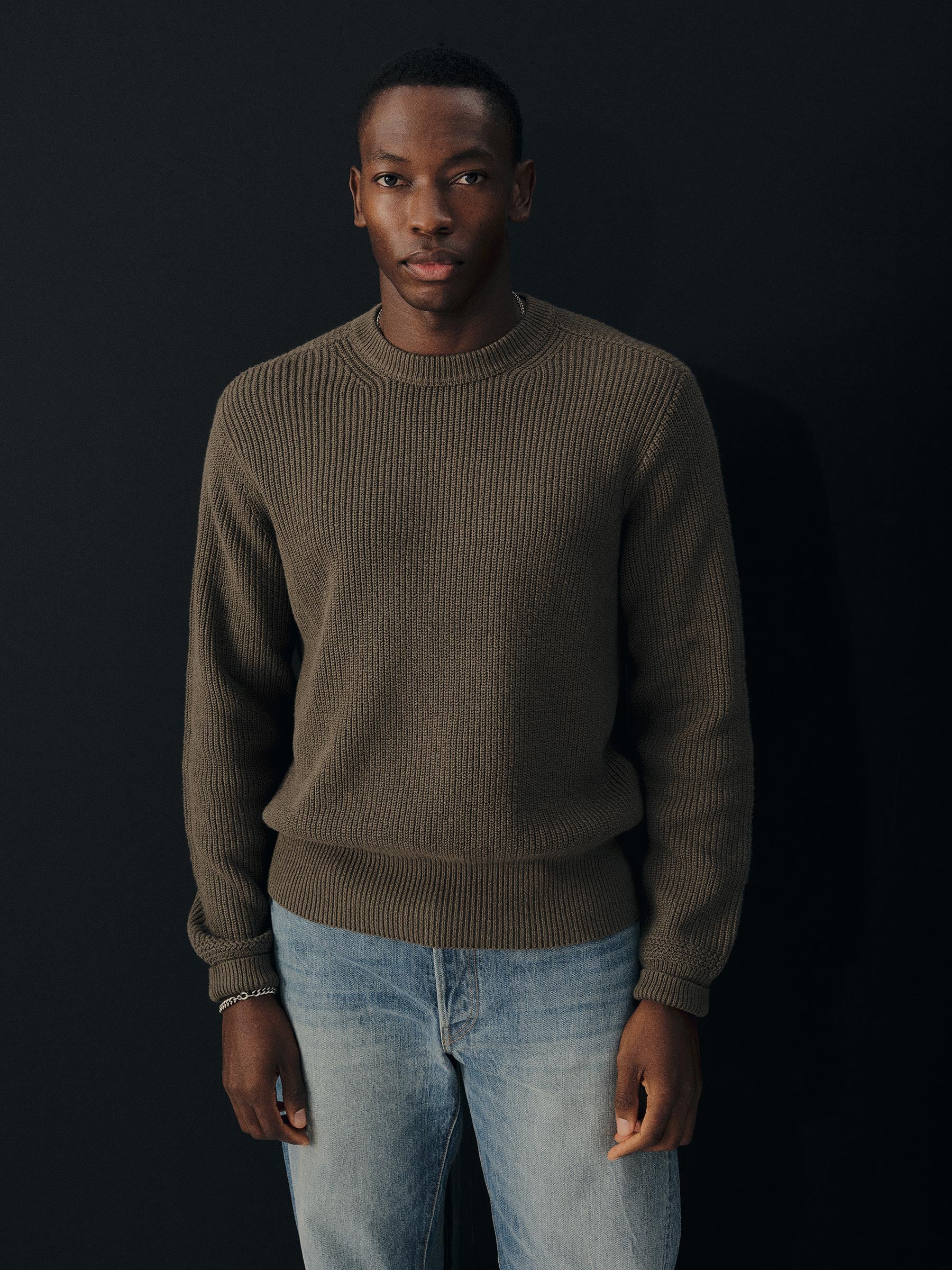 Classic fit crewneck sweater in a homespun textured cotton rib. Constructed with hand-linked seams, double layer ribbing at the collar, and racking stitch detailing at the cuffs.