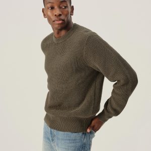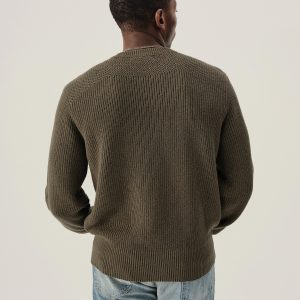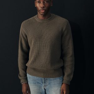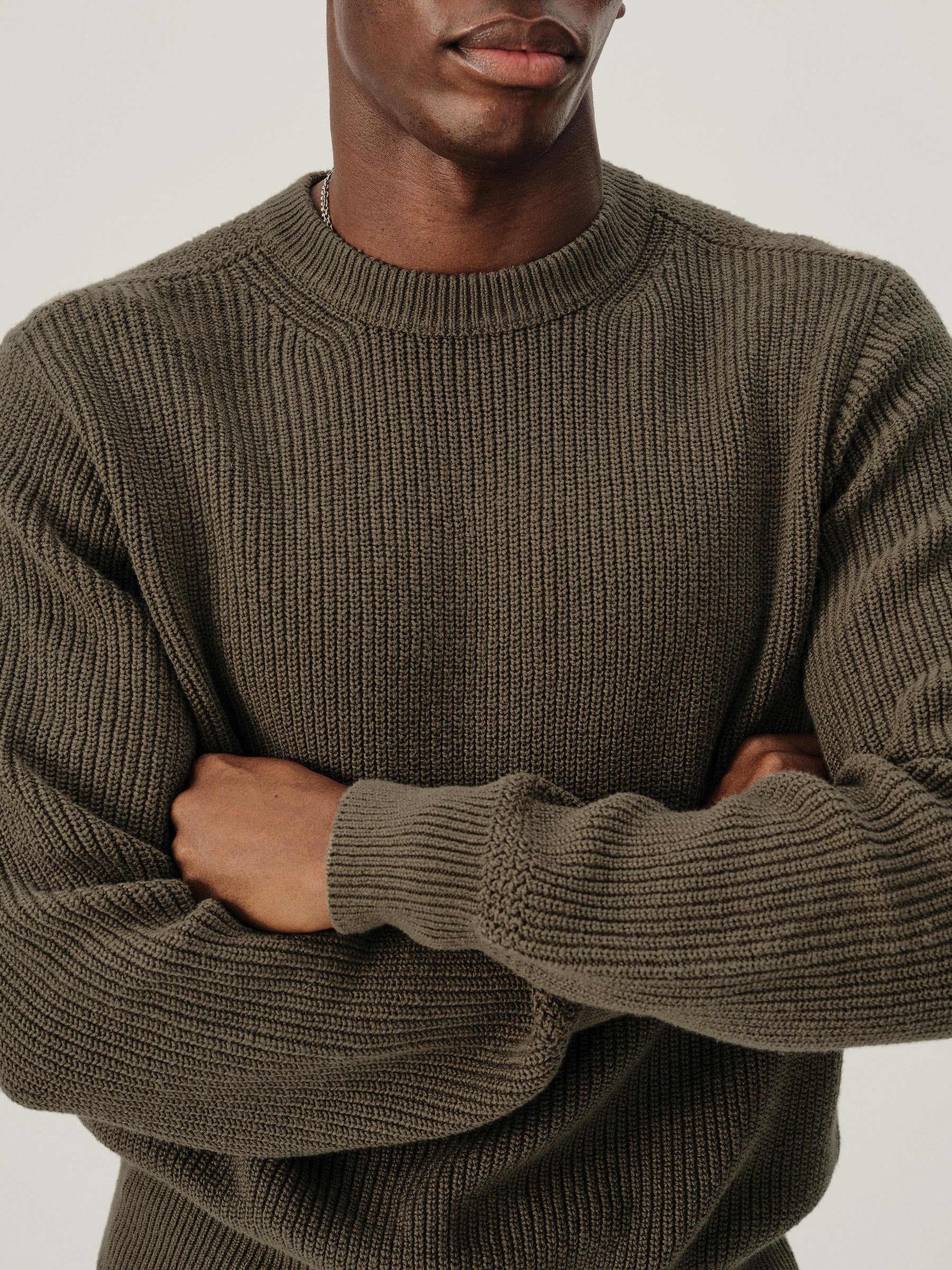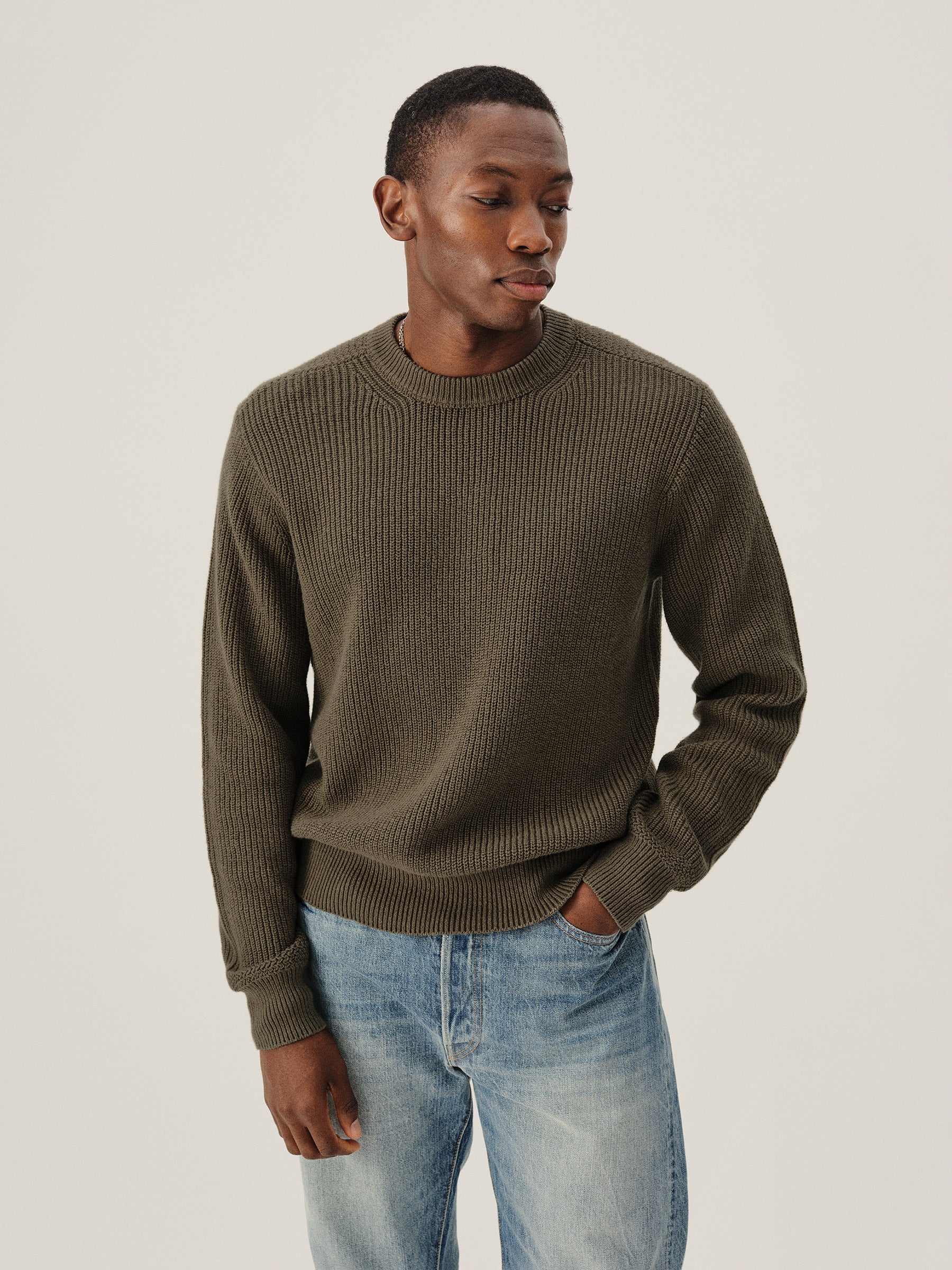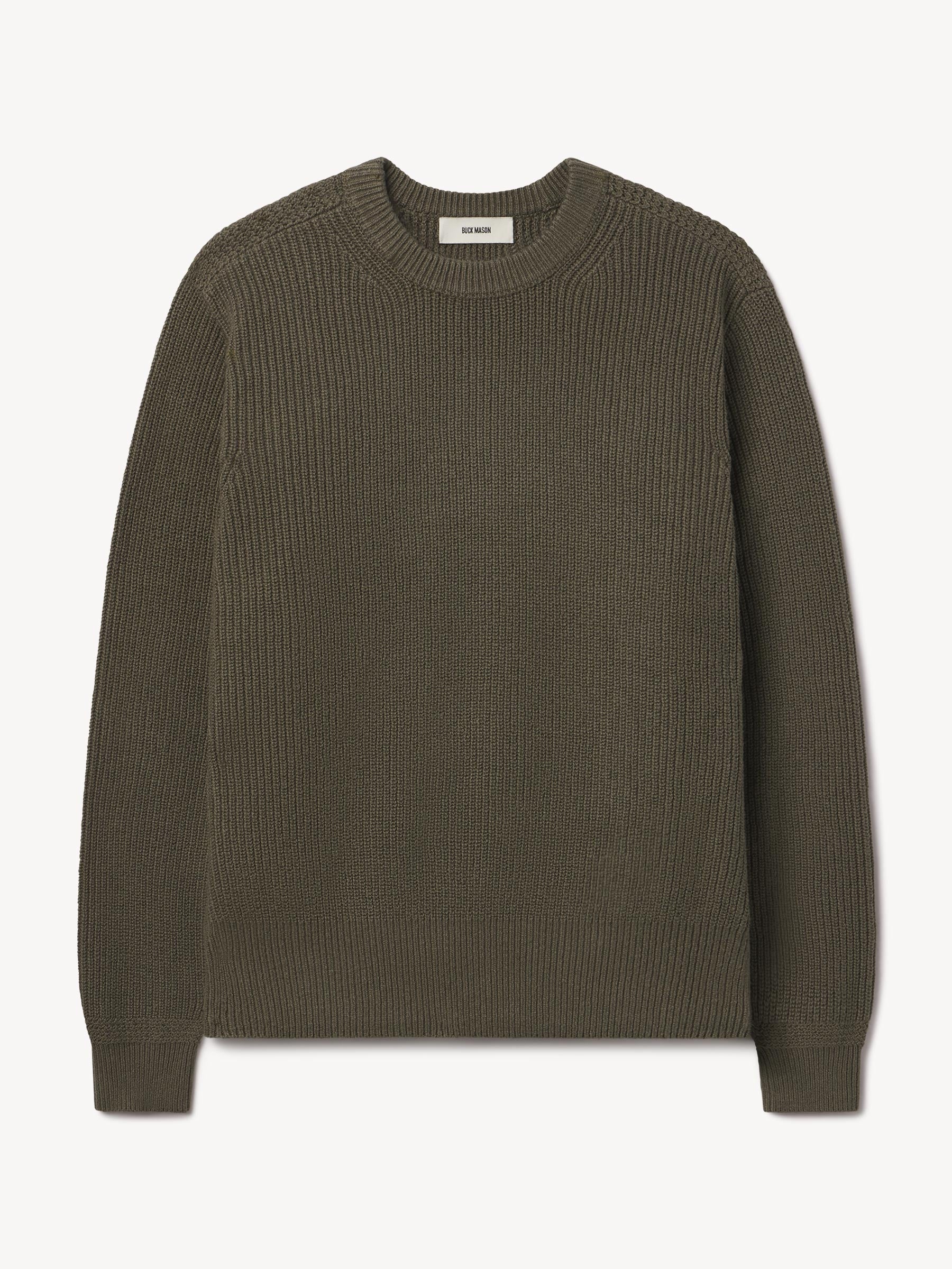 Classic fit crewneck sweater in a homespun textured cotton rib. Constructed with hand-linked seams, double layer ribbing at the collar, and racking stitch detailing at the cuffs.