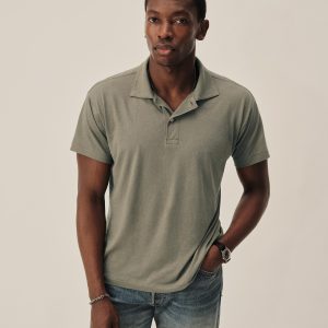 Classic fit polo sweater in a 7 gauge half cardigan rib knit from our homespun yarn-dyed cotton. Features a 3-button rib center front placket with nacre buttons and a rib collar designed to lay flat. Constructed with hand-linked seams and racking stitch detailing at the cuffs.