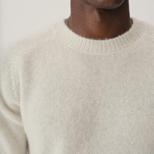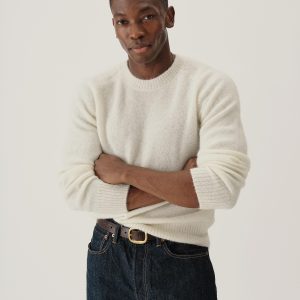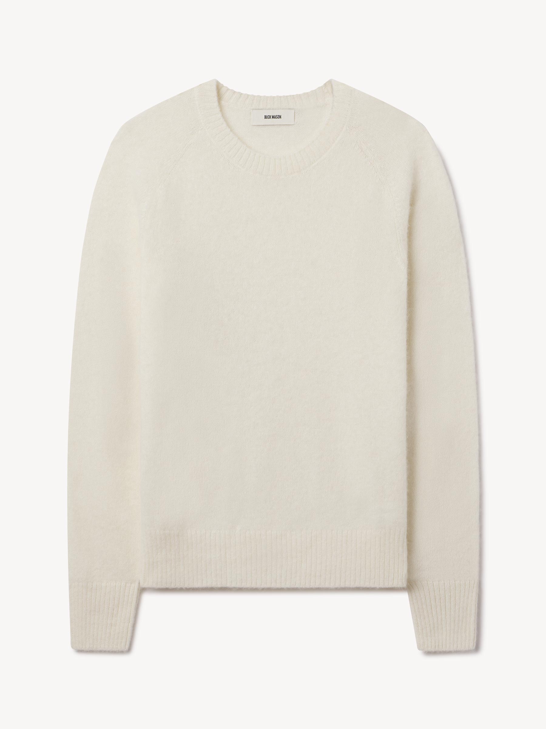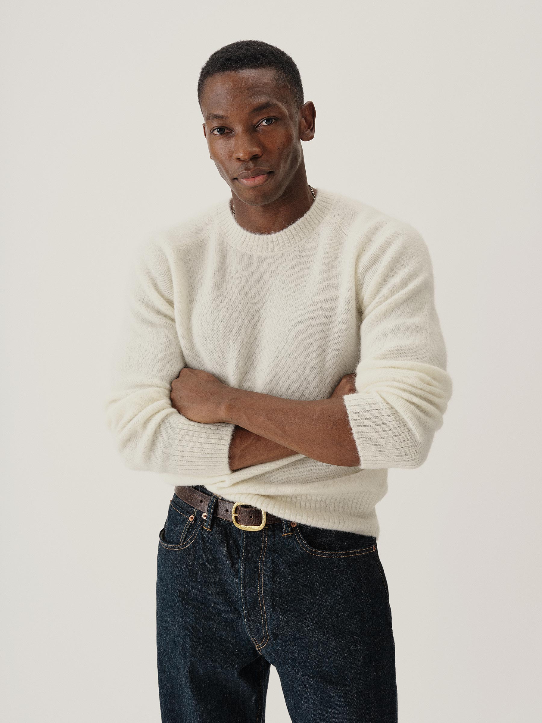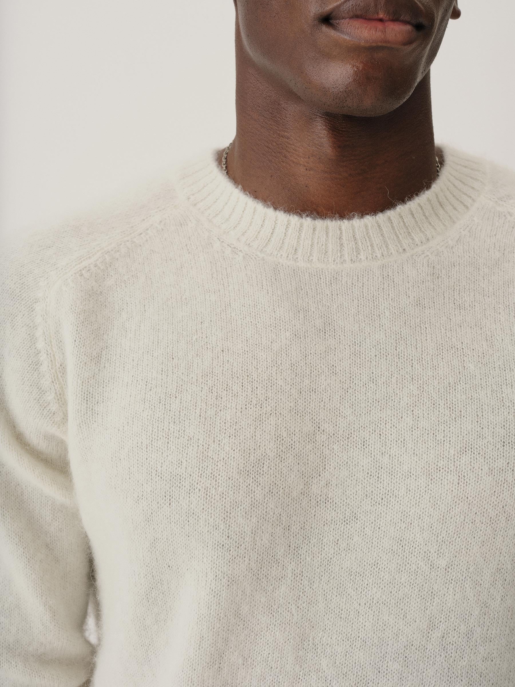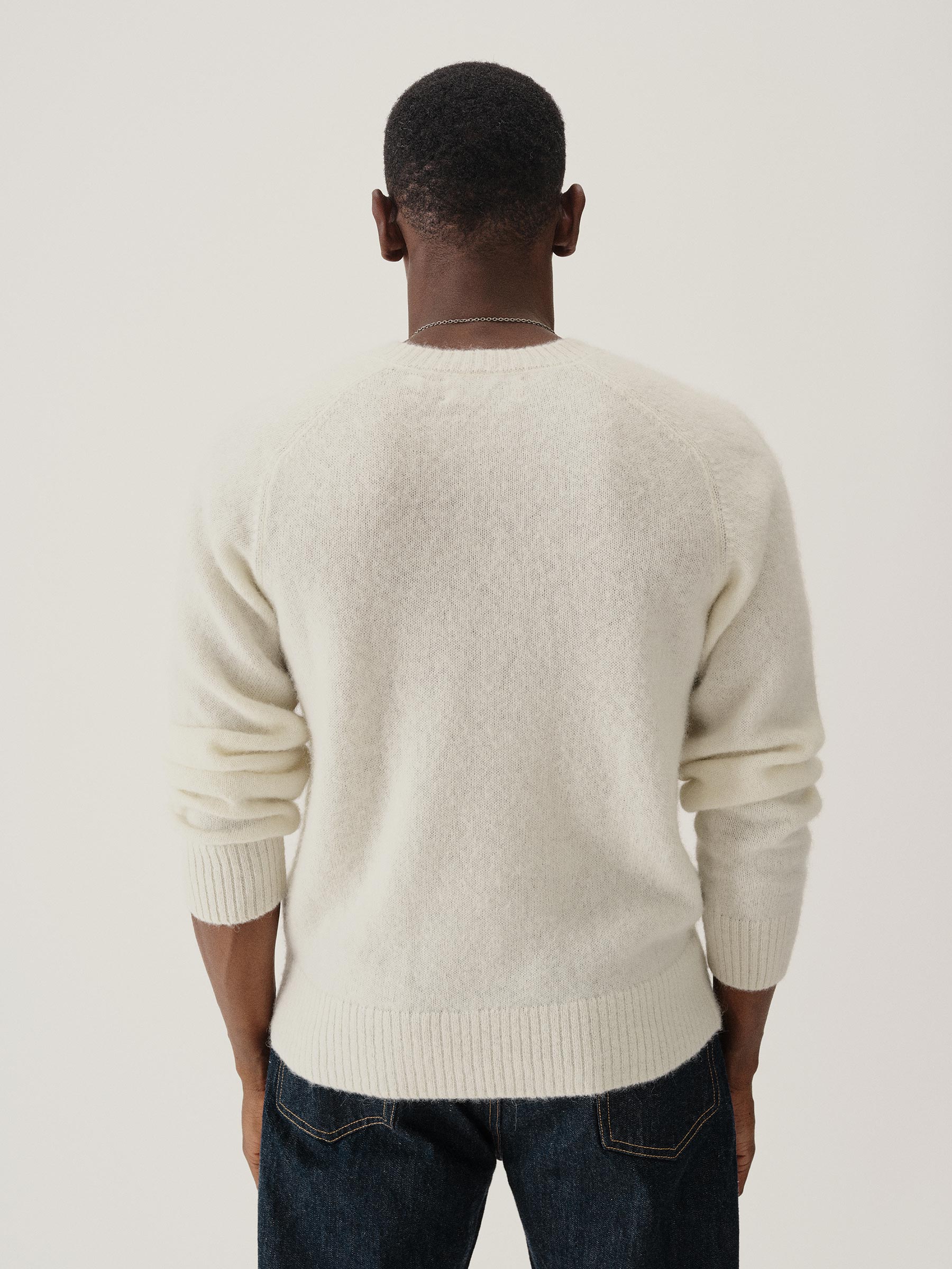 Our makers craft this sweater from a lofty blend of alpaca, recycled fibers, and wool, providing a plush, textured touch. The ribbed collar, cuffs, and hem are double-layered to help hold their shape.