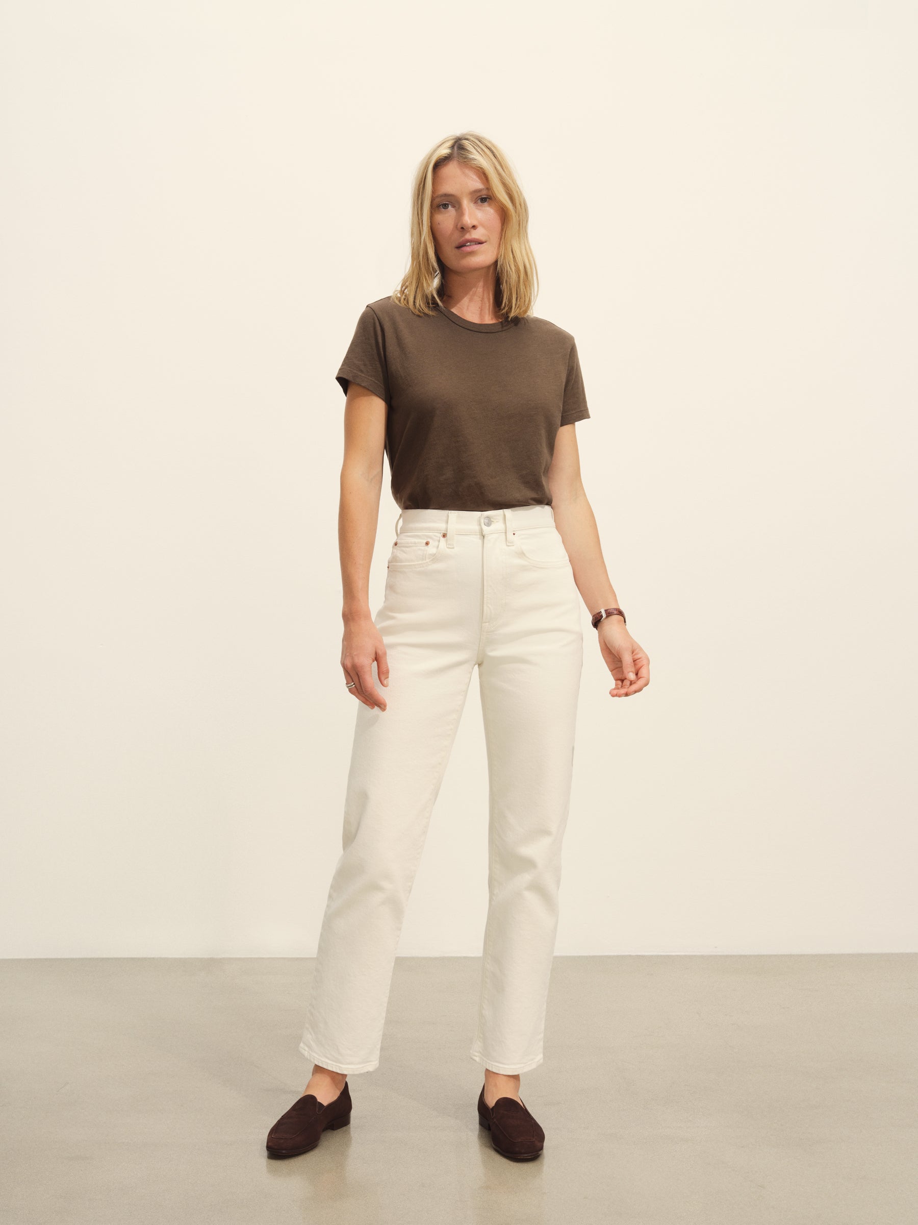 Classic fit short sleeve crewneck tee with a straight hem, cut from 125 GSM cotton with light slub texture. Constructed with self neck binding and ladder stitch detailing at the hems. Garment dyed and washed with softener for a lived in feel.
