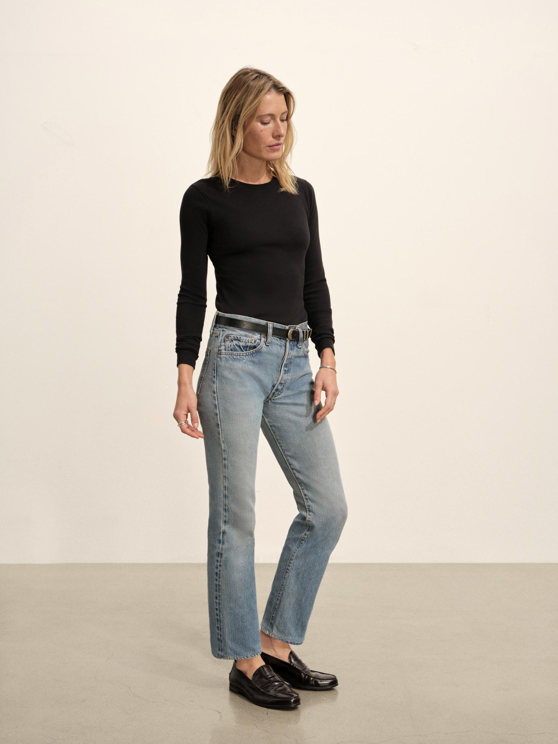 Slim fit ribbed long sleeve tee cut from 295 GSM stretch cotton that holds its shape. 2×2 rib structure—two rows of rib stitch, two rows of jersey stitch—is offset by contrast 1×1 rib at the neck. Constructed with coverstitching throughout and flatlock stitching at the side seams. Garment washed for a lived-in feel.