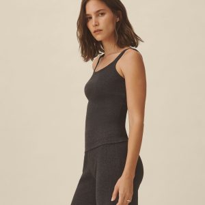 Slim fit ribbed scoop neck tank cut from 295 GSM stretch cotton that holds its shape. 2×2 rib structure—two rows of rib stitch, two rows of jersey stitch—is offset by contrast 1×1 rib at the neck. Constructed with coverstitching throughout and flatlock stitching at the side seams. Garment washed for a lived-in feel.