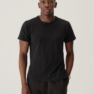 Cut from a midweight 200 GSM USA-grown cotton, developed, milled, and sewn at BM Knitting Mills in Mohnton, PA. This 90s-inspired boxy crewneck tee has a straight hemline, longer sleeves that hit lower on the bicep, and a wide ribbed collar. Bound neck and screen-printed label for comfort, constructed with a split-needle cover stitch at shoulders and armholes. Double-washed for a soft, smooth texture and consistent fit.