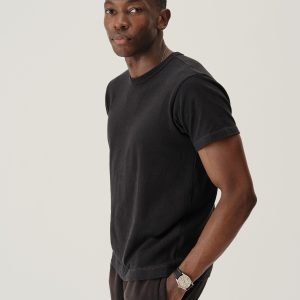 Cut from a midweight 200 GSM USA-grown cotton, developed, milled, and sewn at BM Knitting Mills in Mohnton, PA. This classic fit crewneck tee has a straight hemline, bound neck and screen-printed label for comfort. Constructed with a split-needle cover stitch at shoulders and armholes. Double-washed for a soft, smooth texture and consistent fit.