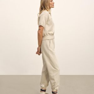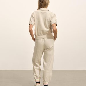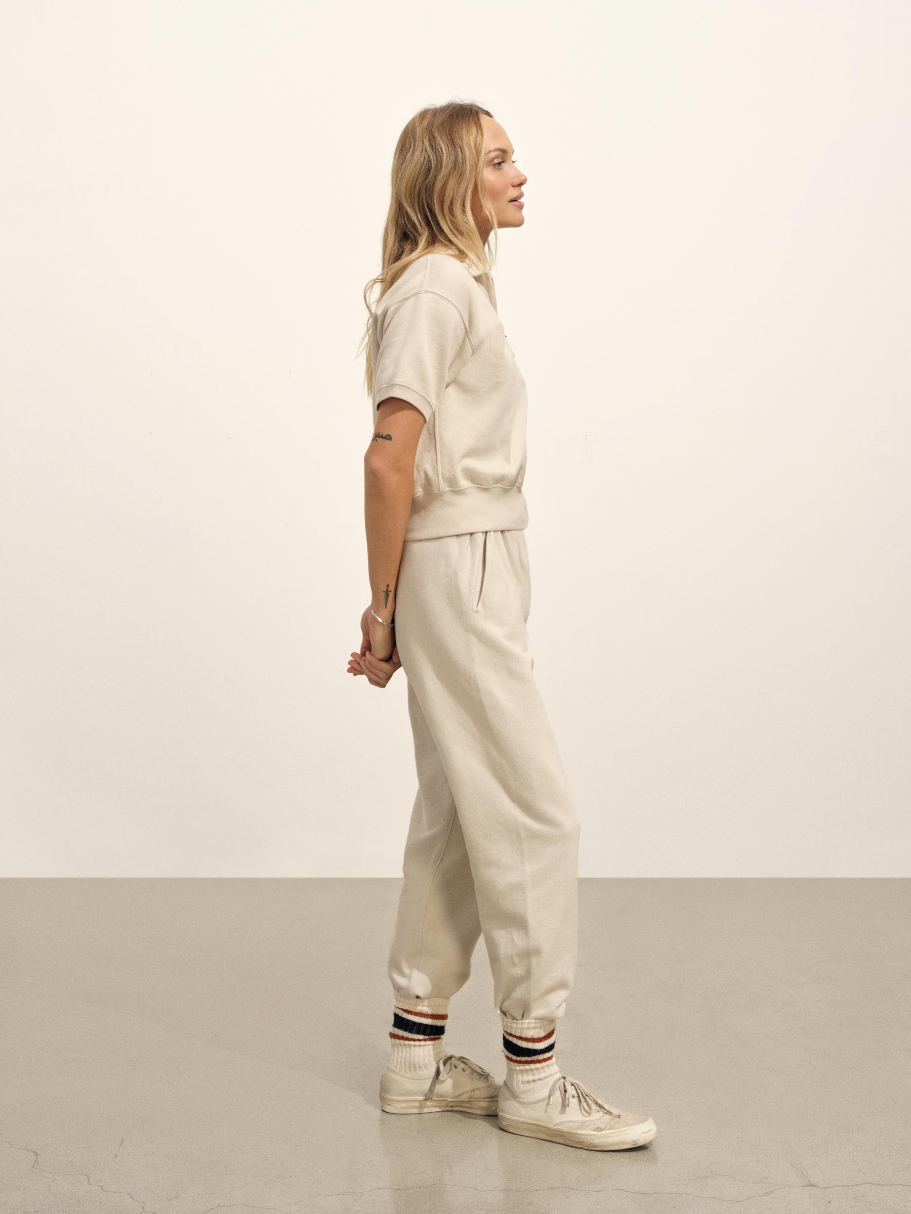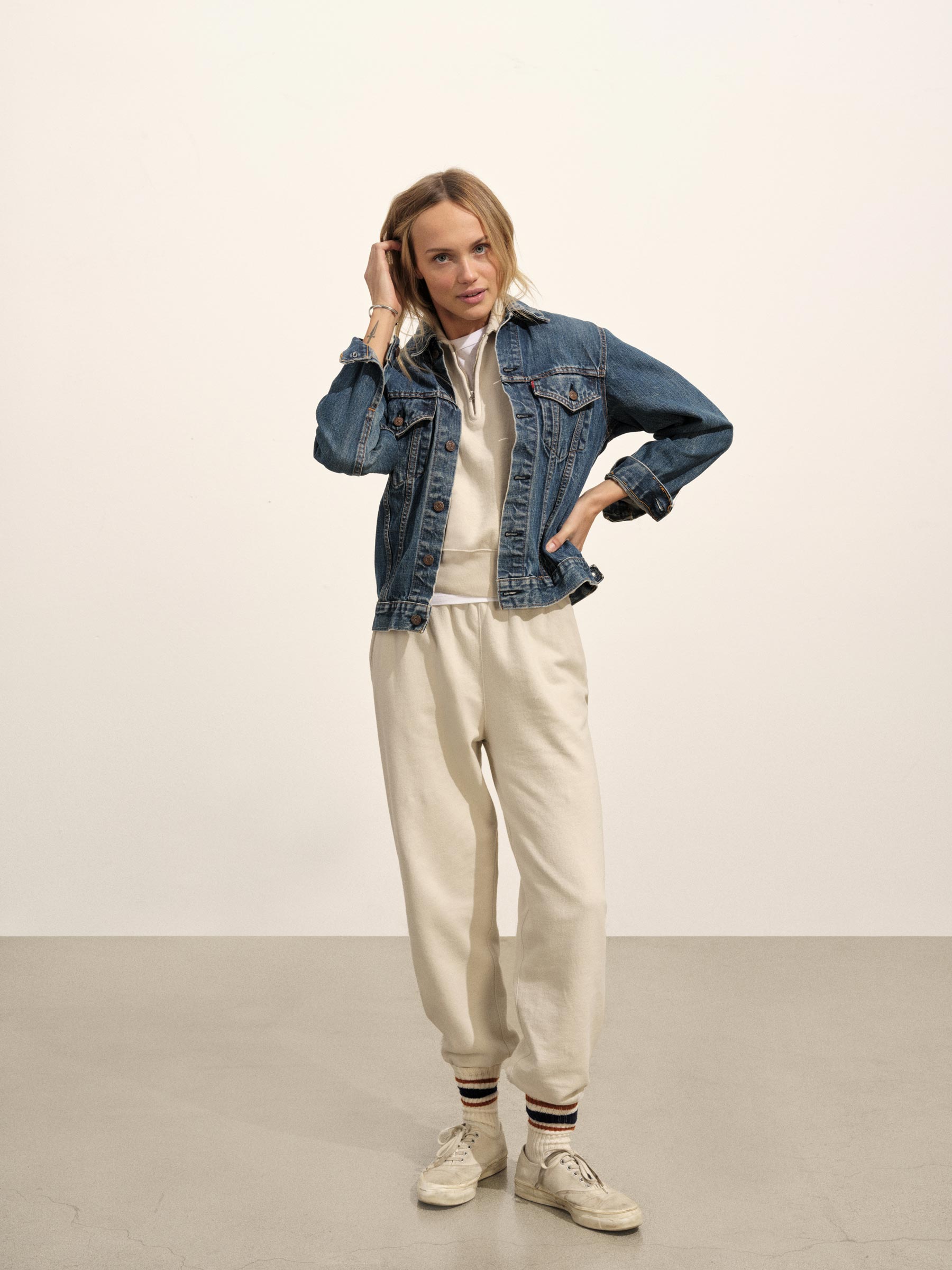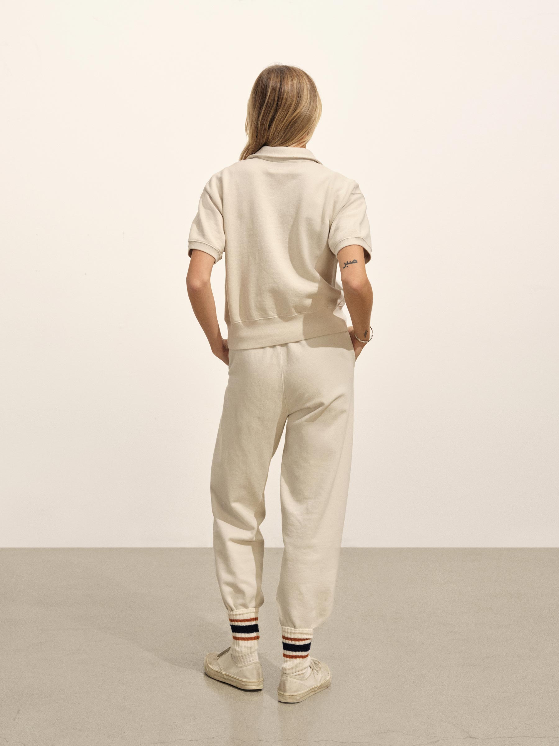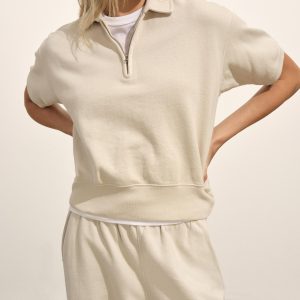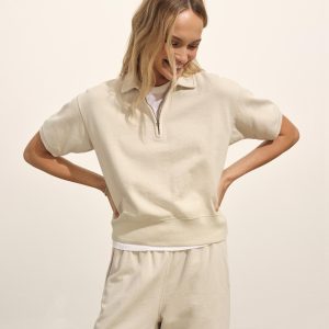 Oversized, quarter-zip sweatshirt that sits below the waist. Features an off-shoulder fit with rib-banded cuffs and hem.