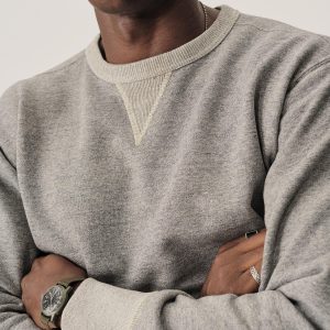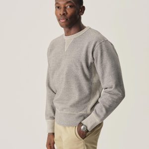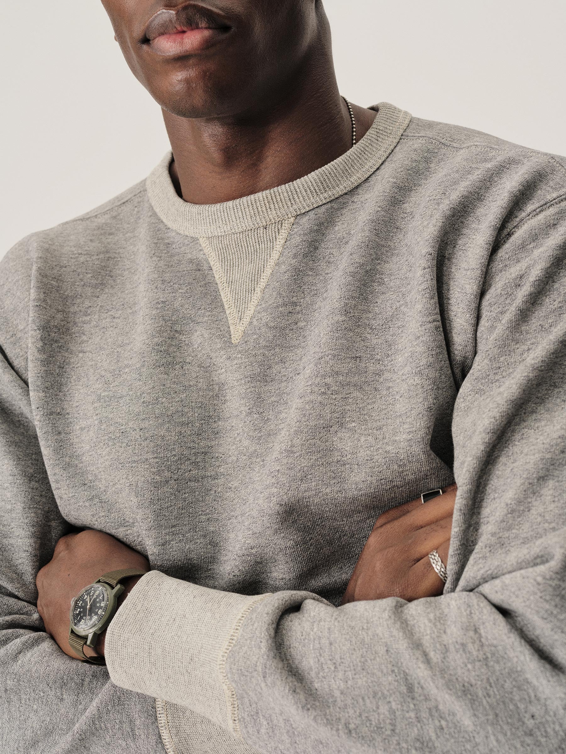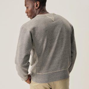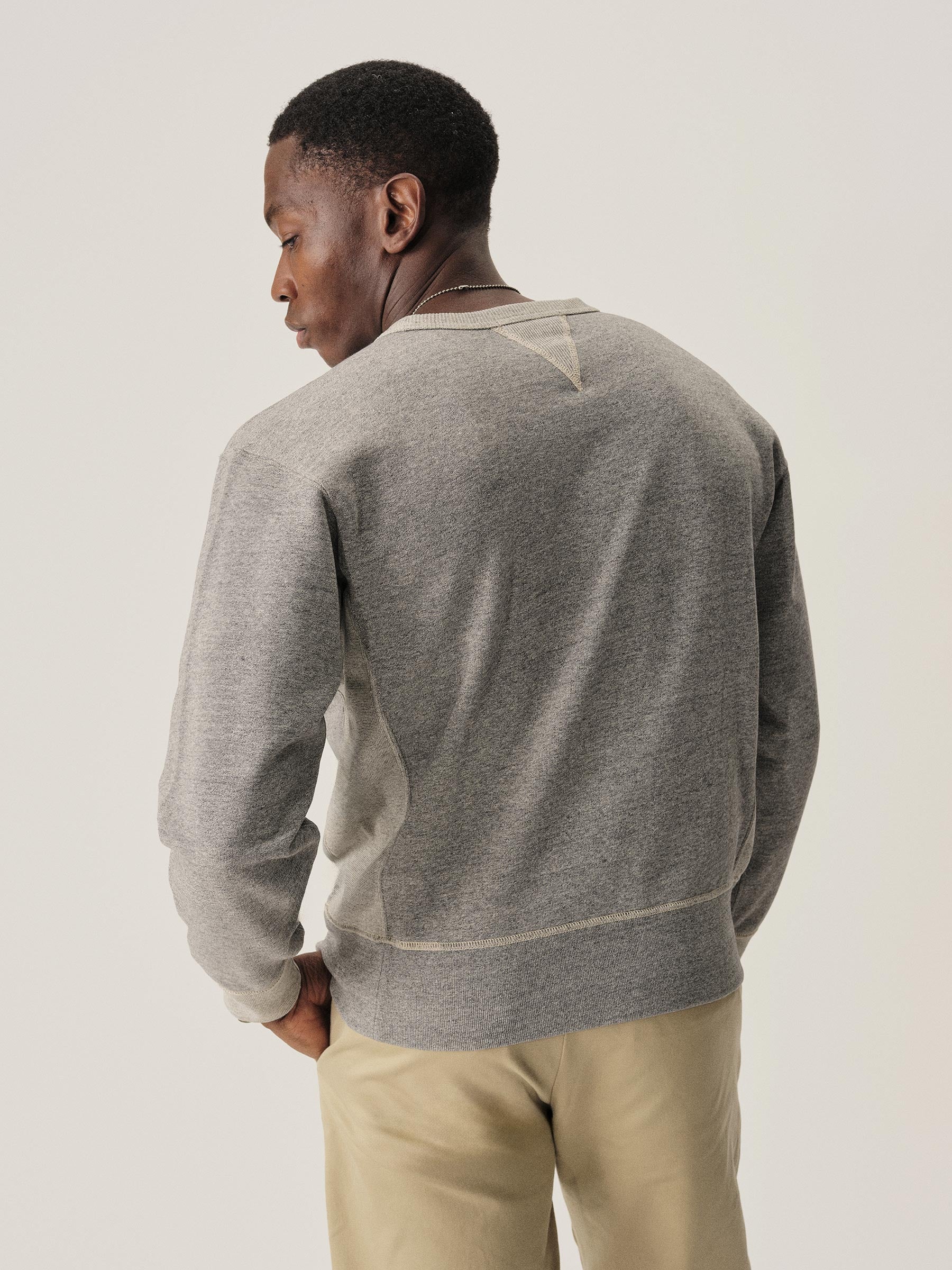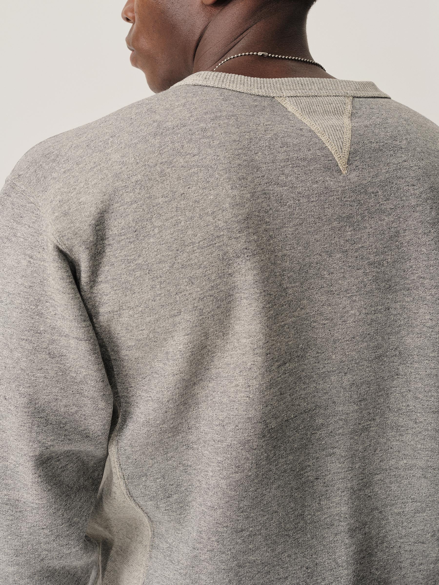 A midcentury-inspired crewneck sweatshirt made from plush, not-too-heavy, not-too-light, welterweight French terry. Features a “V” detailing at the front and back neck opening that was commonly found on sweatshirts from the 1940s and 50s.
