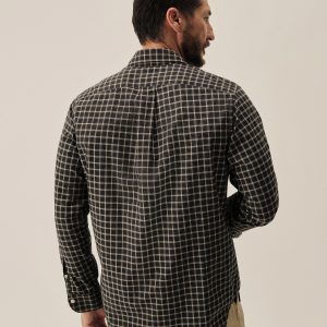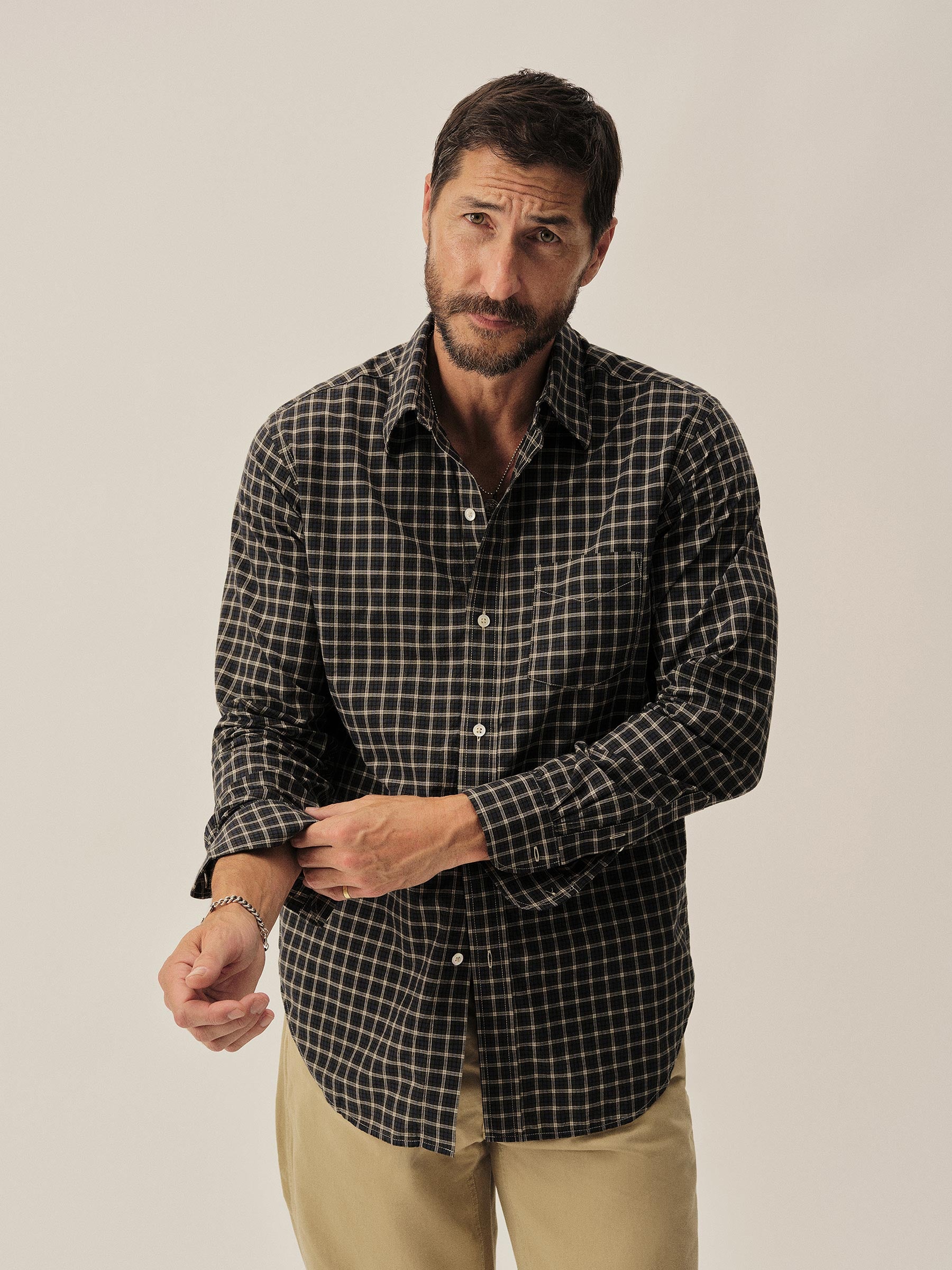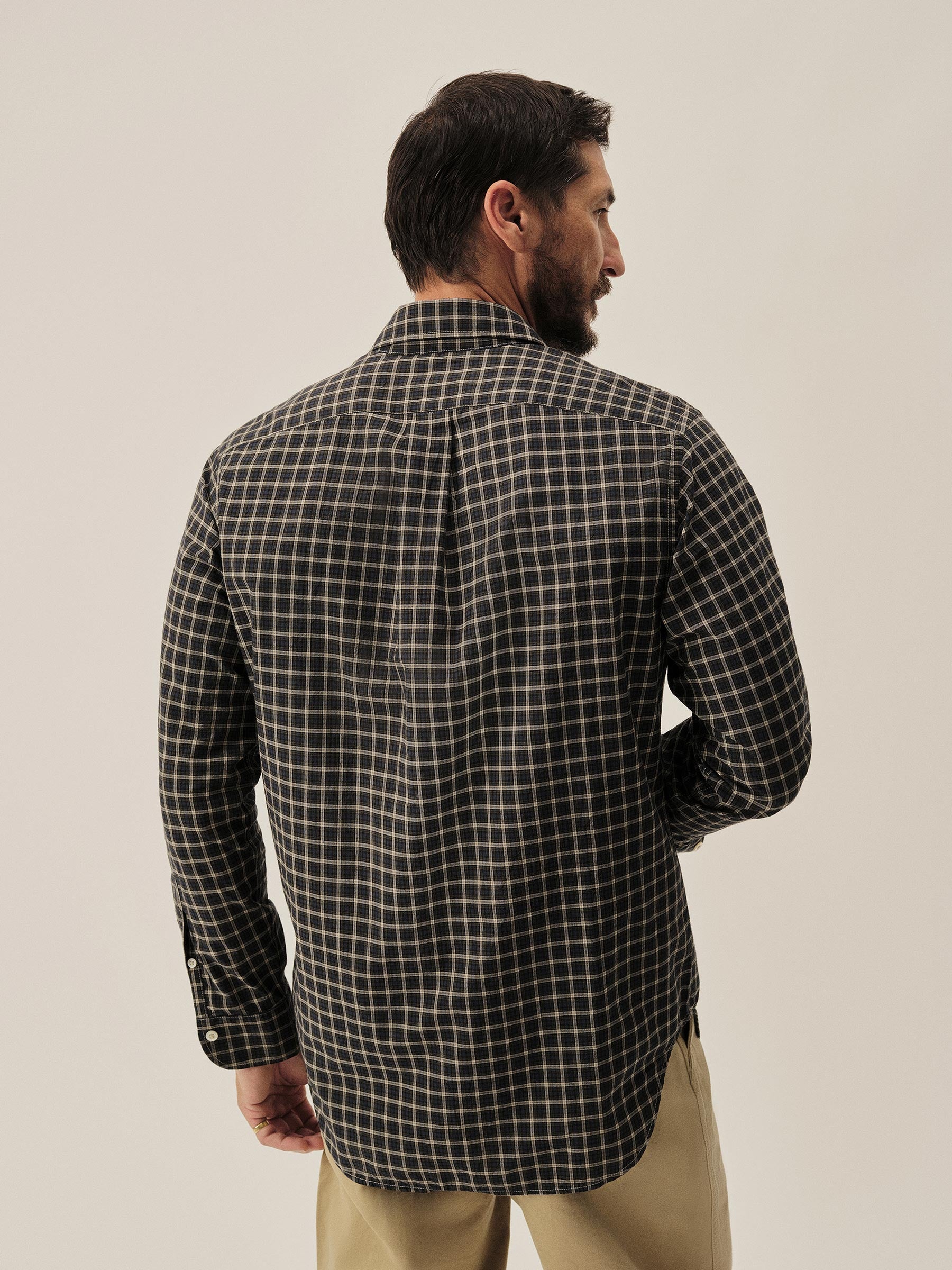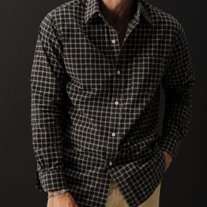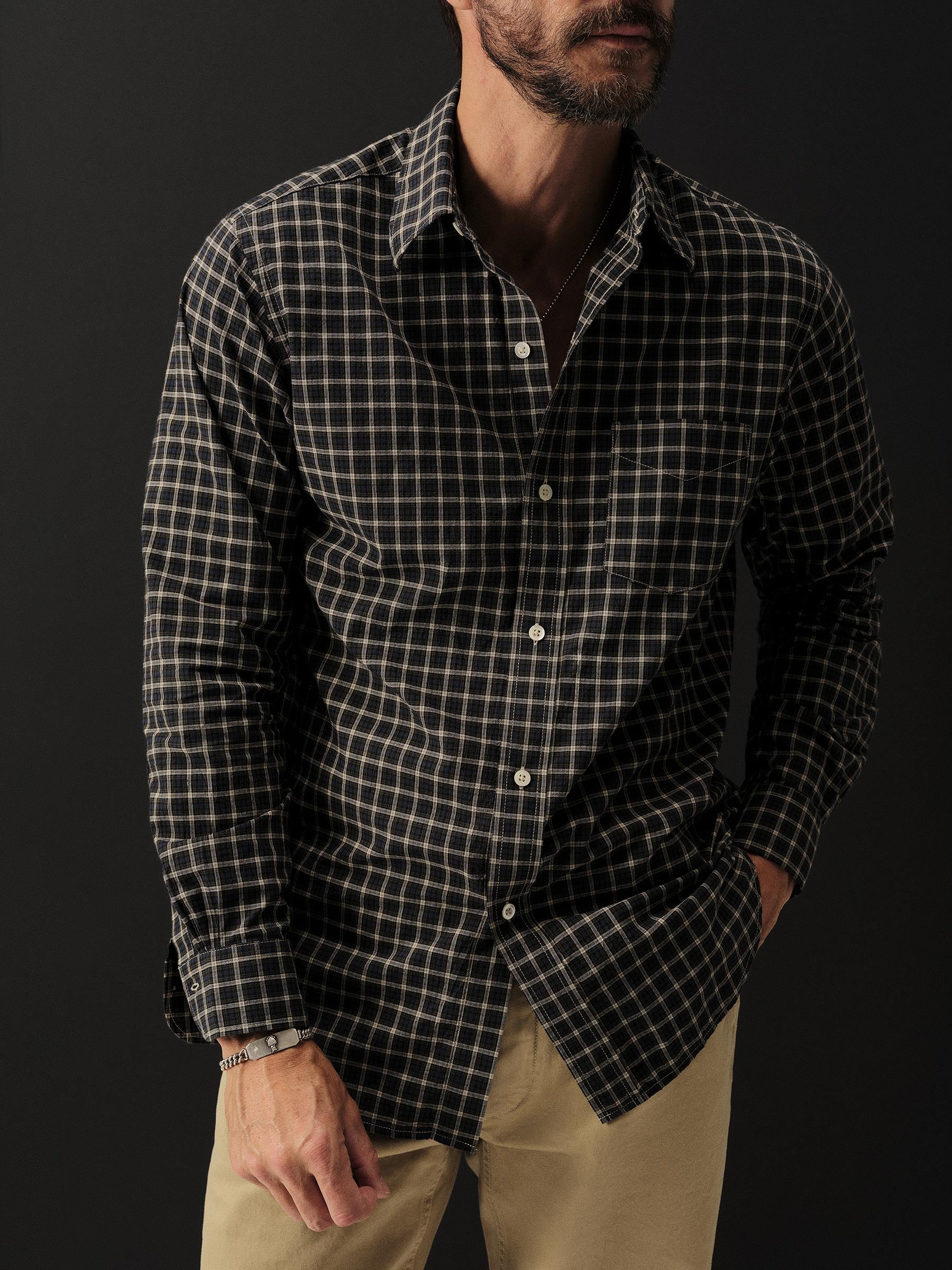 Slim fit long sleeve button-up cut from 4 oz. washed cotton. Details include a button placket, a single spade pocket at the chest, and a box pleat at the back yoke. Constructed with single needle topstitch detailing with double needle stitching at the collar and cuffs.