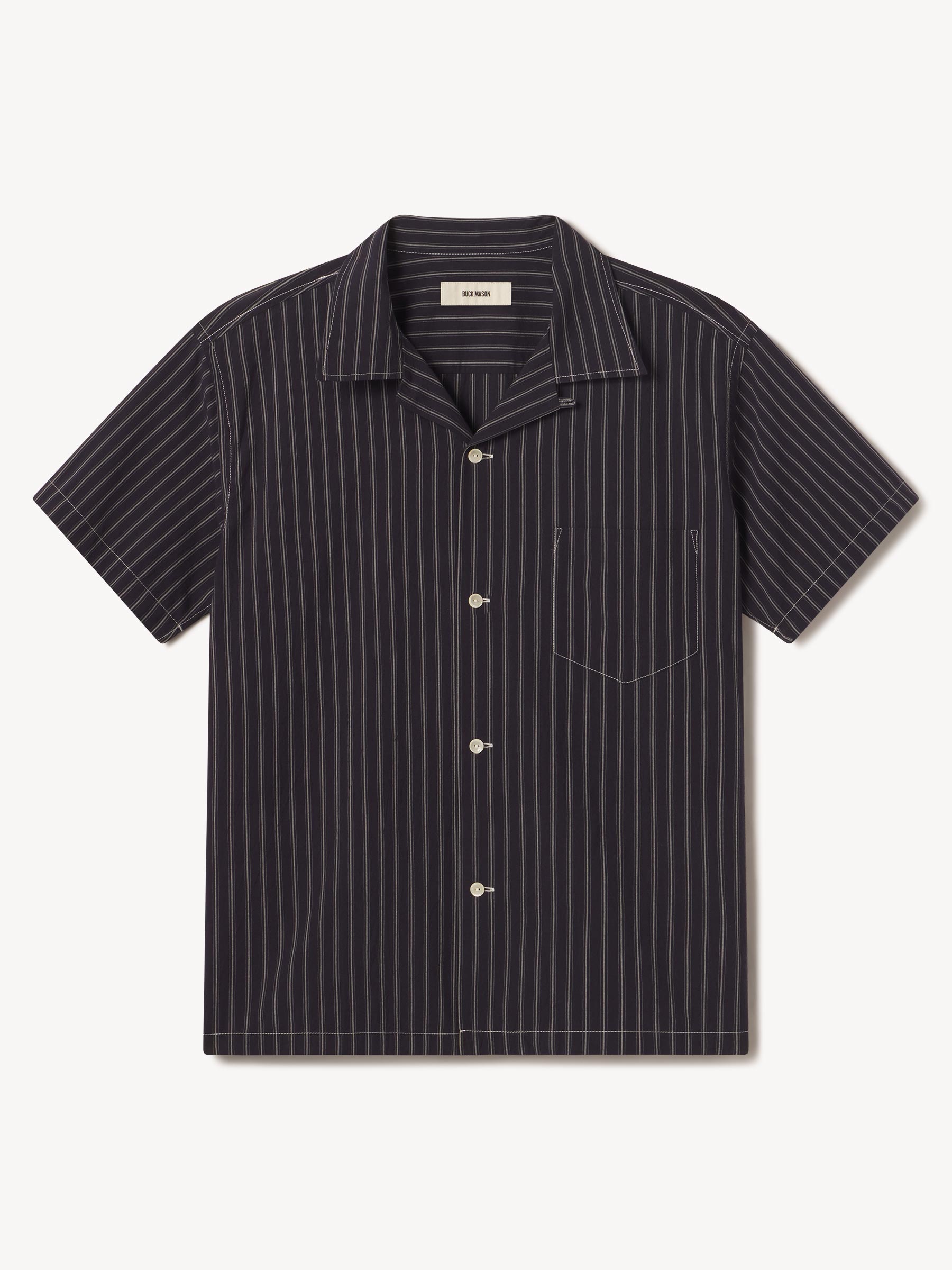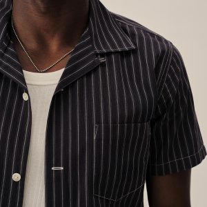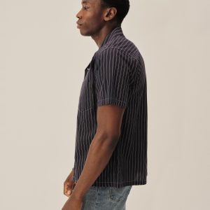 Classic fit short sleeve camp collar button up cut from a mercerized 4 oz. washed cotton. Features a four-button placket with mother of pearl buttons, a single spade chest pocket, and a loop and button closure at the neck. Constructed with clean finished seams. Garment washed with enzymes for a lived-in feel.