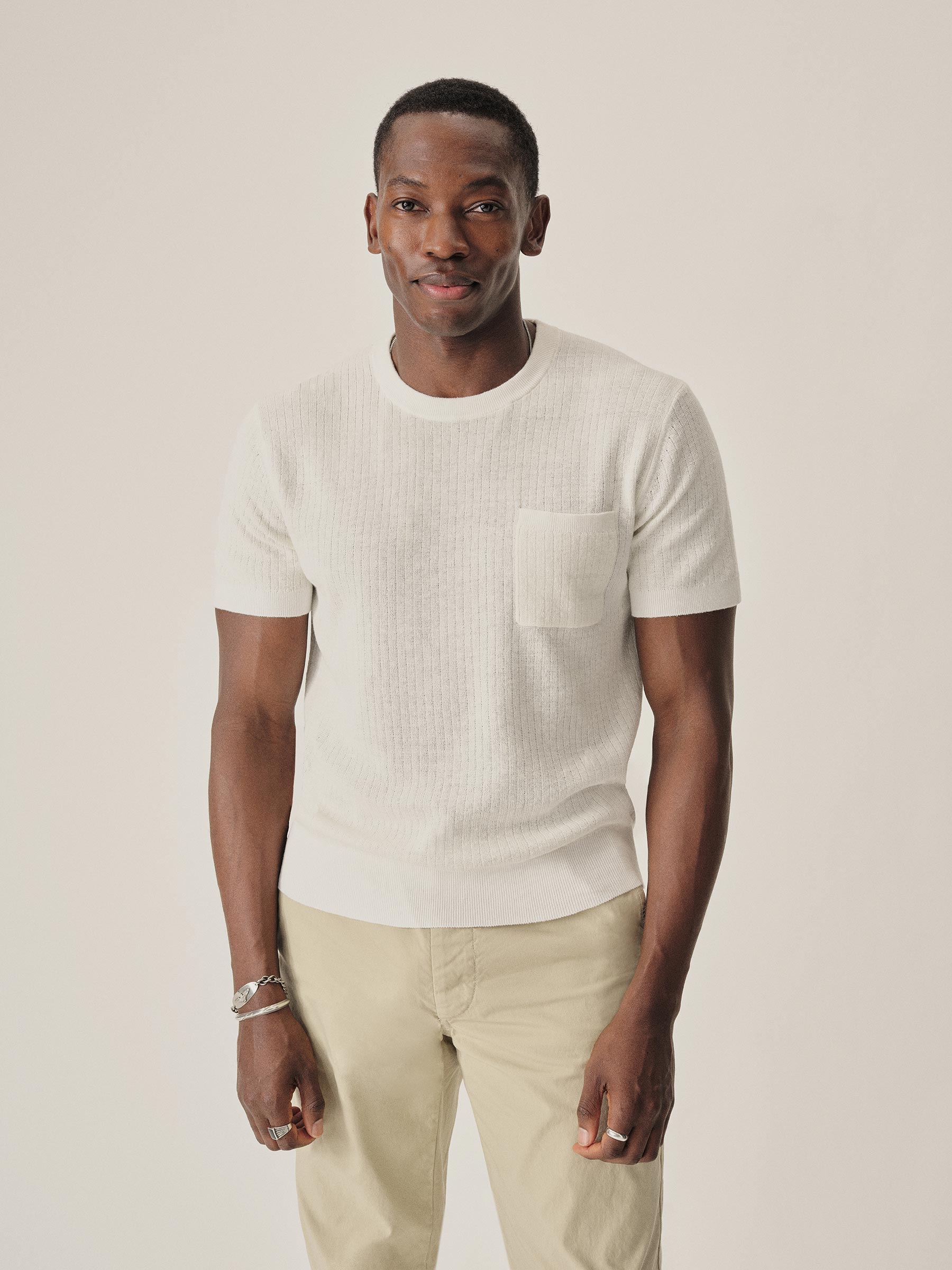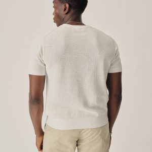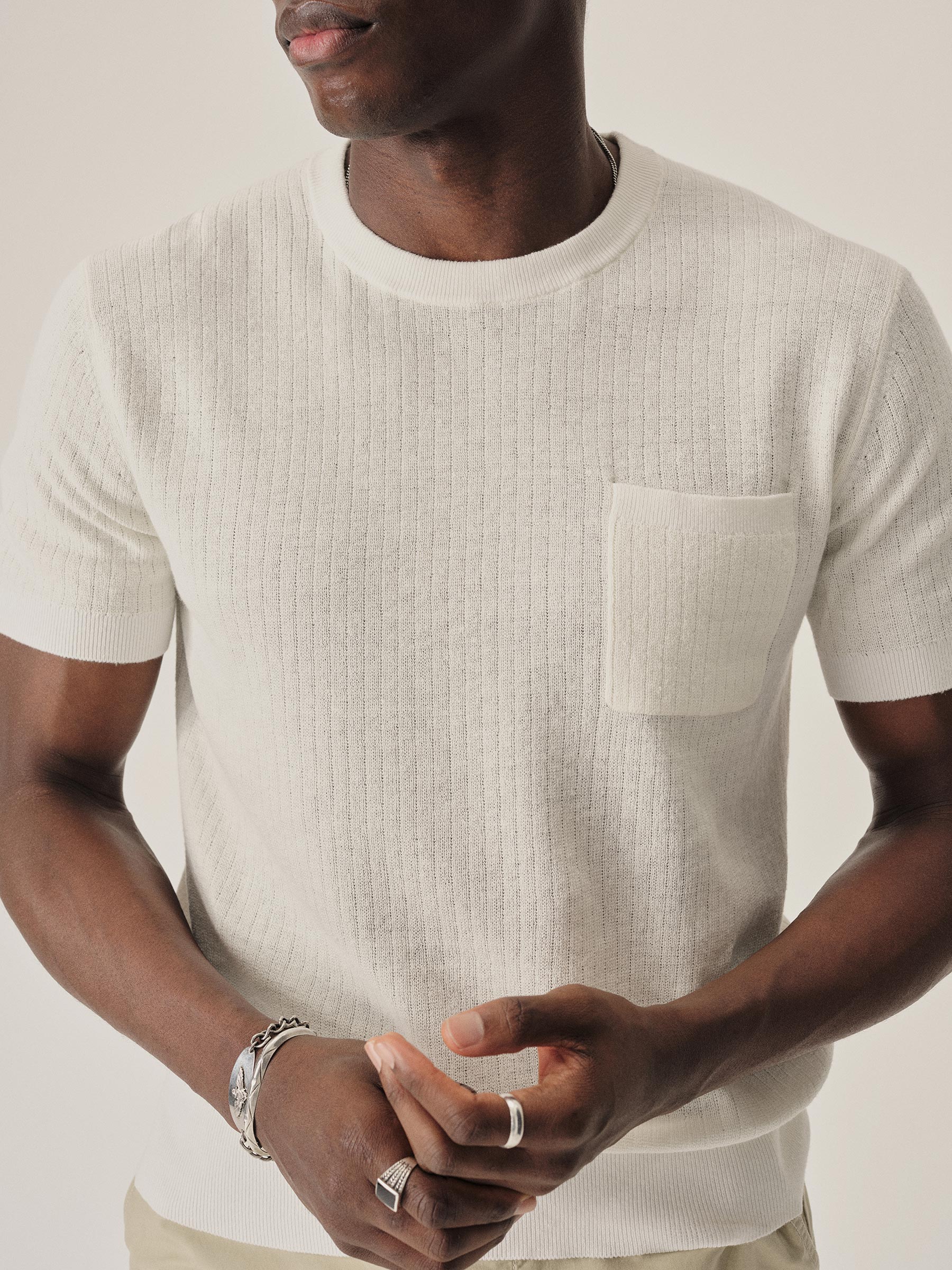 A classic fit tee in a fine knit drop-needle rib construction. Made from 12 gauge yarn-dyed hemp/cotton blend that wicks moisture and breathes easily. Chest pocket with ribbed opening. Finished with a 1×1 rib at collar, cuffs and waistband. A versatile summer layer inspired by vintage rib tees.